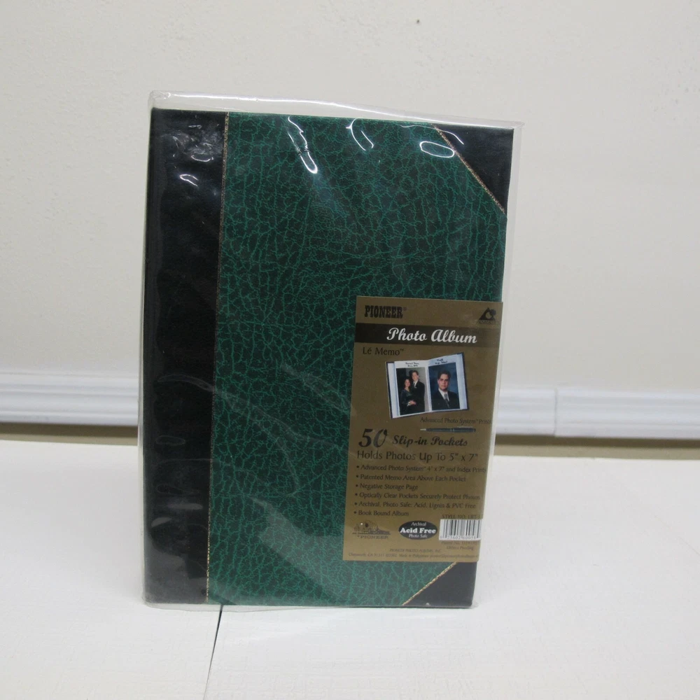 Pioneer Le Memo Photo Album - green/black 50 slip-in pockets Holds up to 5x7" photos Negative Storage Page Memo area above each pocket new