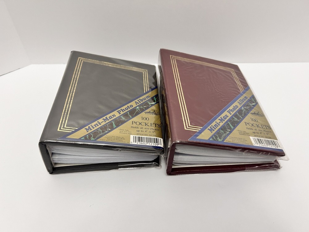 This Pioneer Mini Max Bound Photo Album is the perfect addition to any family's collection. With the ability to hold up to 100 4x6" photos, this album is perfect for showcasing your favorite moments. These albums come in a stunning burgundy and classic black color, both with gold accents and is manufactured by Pioneer Photo Album, a trusted brand in the industry. The album is a 1 up format and is bound with 50 pages, providing ample space for your photos. Included are two albums, manufactured in China. Whether you're a professional or a family looking to add an album to your collection, this Pioneer Mini Max Bound Photo Album is a great choice.