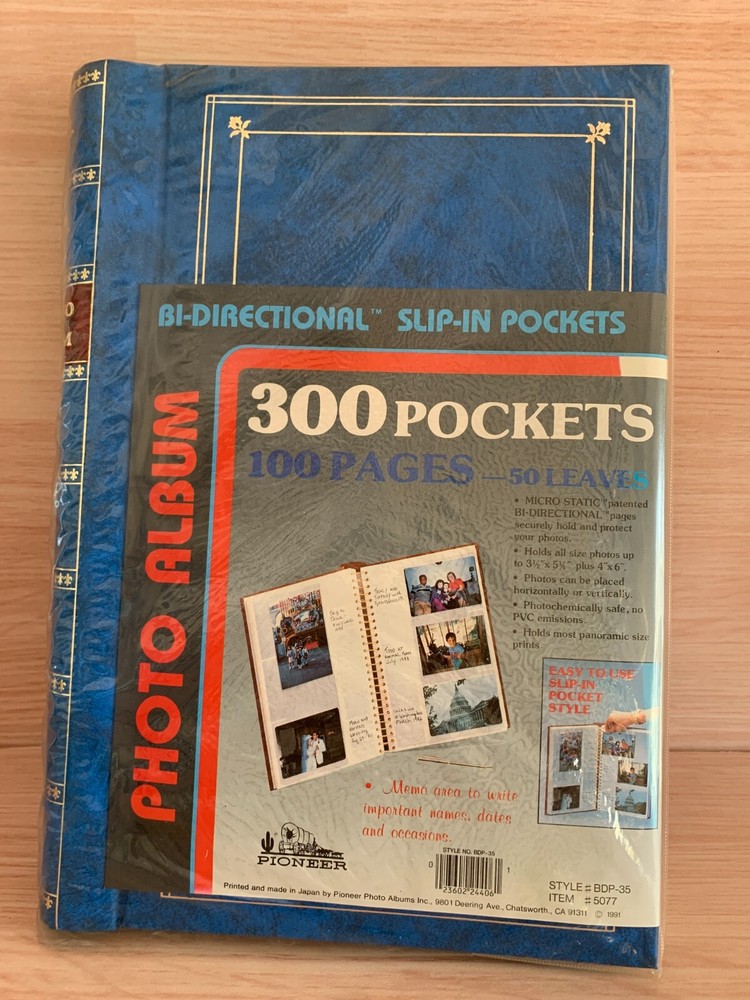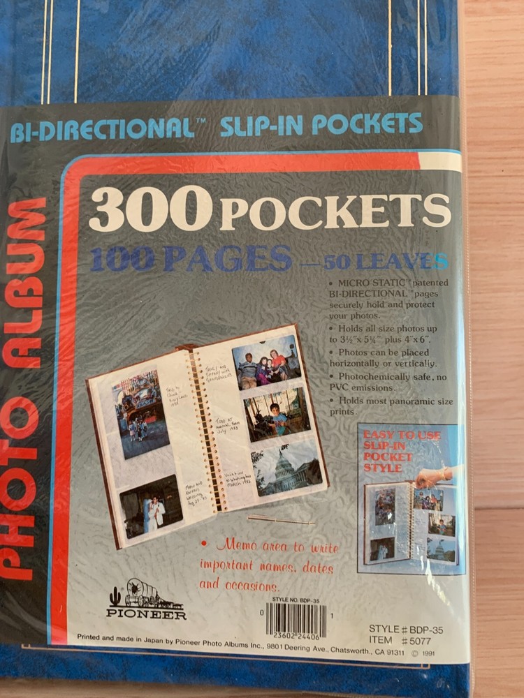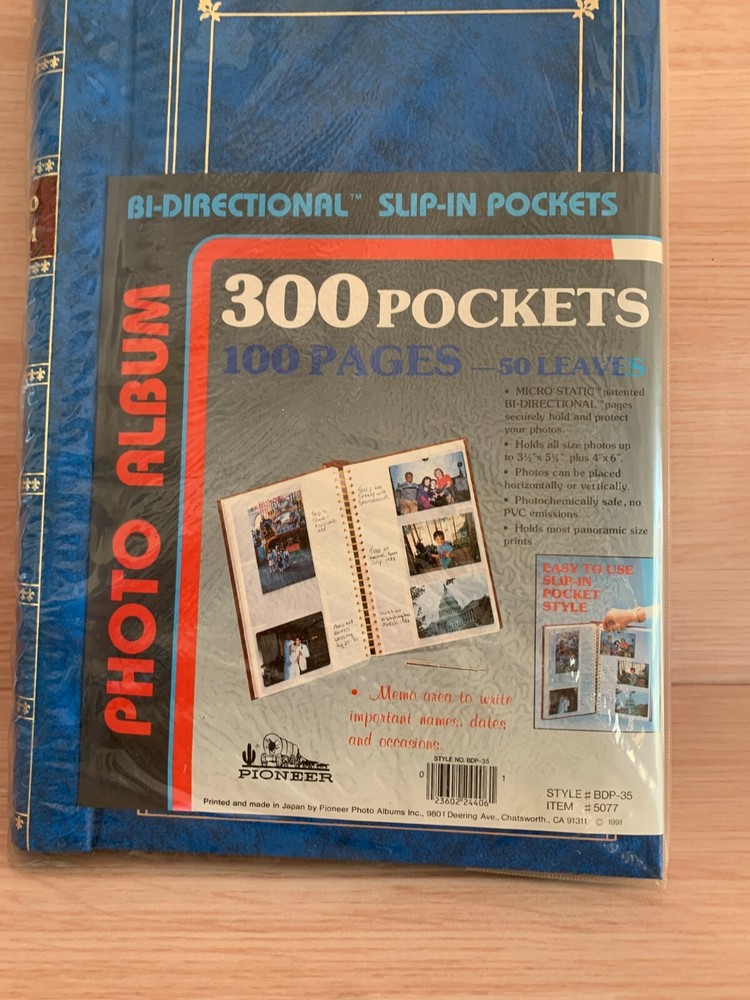 The Pioneer Photo Album BDP-35 is a slip-in album designed to hold up to 300 4"x6" photos. It features a blue Endurahide faux leather cover with a brass spiral bound format. The album is ideal for storing family memories and is made in Japan with high-quality materials. The Pioneer BDP-35 ensures easy organization and protection for your cherished photographs.