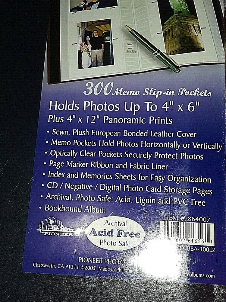 Pioneer Photo Album Sewn Leather Bonded 300 Memo Slip in Pockets Hold Photos up to 4"x 6" Plus 4" x 12" Panoramic Sewn Plush European Bonded Leather Covers Memo Pockets Hold Photos Horizontally or Vertically Optically Clear Pockets Securely Protect Photos Page Marker Ribbon and Fabric Liner Index and Memories Sheets for Easy Organizations CD? Negative/ Digital Photo Card Storage Pages Archival . Photo Safe: Acid , Lignin and PVC Free Book Bound Alum Customers outside of the US may have to pay an import fee when your item arrives. If you don't want to hassle with that then pick Global Shipping Option and they will do that for you!