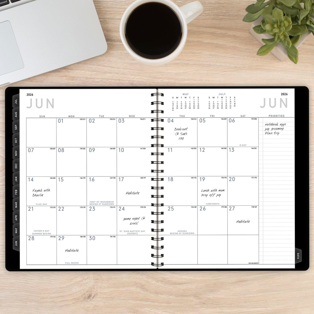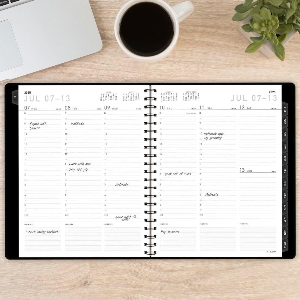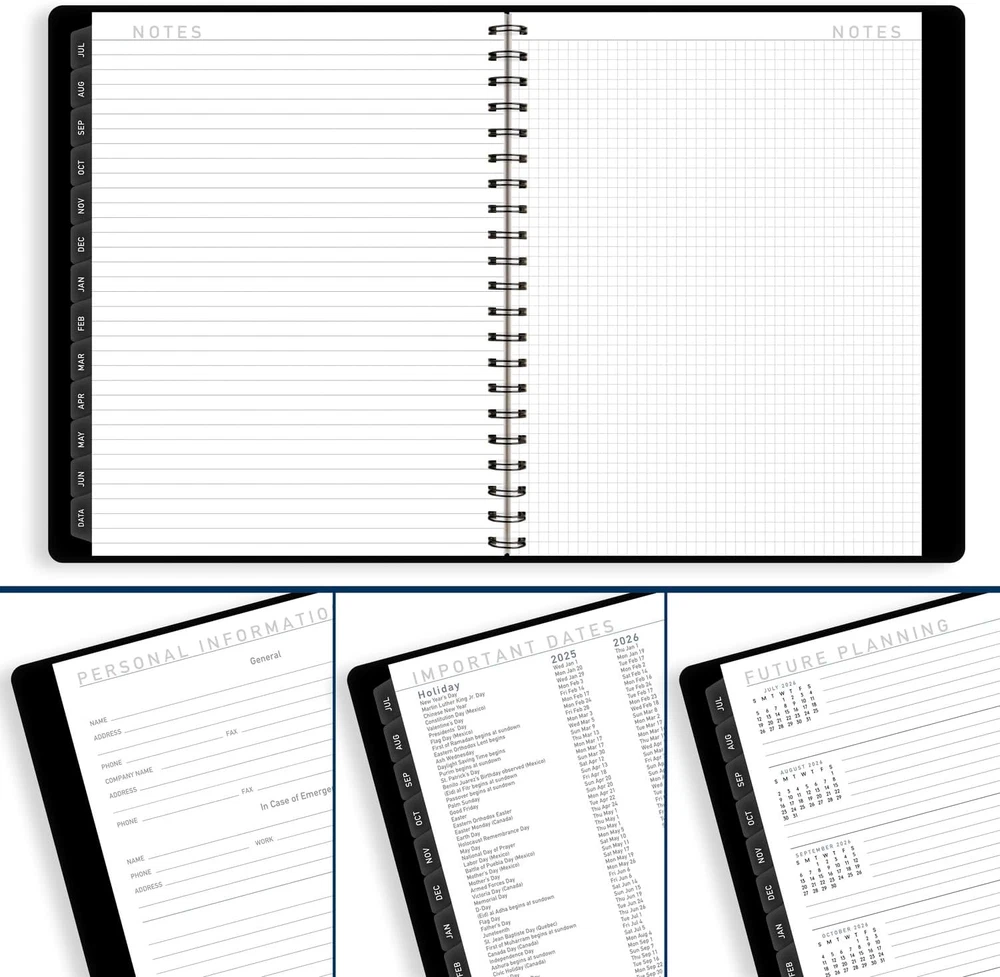 ACADEMIC PLANNING – Stay on track all year long. Date range covers 12 months from July 2025 — June 2026 with Julian dates. GUARANTEED TO LAST ALL YEAR – ACCO Brands will replace any defective AT-A-GLANCE planner that is returned within one year from the date of purchase. This guarantee does not cover damage due to misuse or abuse. INK BLEED RESISTANCE – Plan your schedule without fear of distracting ink bleeding. Our improved, high-quality paper features ink bleed resistance to keep your planning pages neat. WEEKLY & MONTHLY OVERVIEWS – Detail your work week with ruled, half hourly appointments from 8:00 a.m. – 5:30 p.m., Monday to Friday. Months are tabbed for easy navigation. 8-1/4" x 11" page size. ENHANCED ORGANIZATION – Expand your organizational skills. Special pages include over 40 notes pages, a 3-year reference calendar, future planning, important dates and a double-sided poly pocket. MODERN STYLE – Professional materials for professional organization. The durable black faux leather cover secures your schedule while the strong twin wire binding helps prevent snags and keeps pages secure. Clear and simple organization to help you stay ahead of the curve. The AT-A-GLANCE Contemporary Academic Weekly Monthly Planner covers 12 months from July 2025 — June 2026 with Julian dates. Guaranteed to last all year.* Perfect for anyone who plans on the academic timeline. Modern foil accents enhance the stylish black cover for a touch of sophistication. Plan your schedule without fear of distracting ink bleeding. Our high-quality paper features ink bleed resistance to keep your planning pages neat. Detail your work week with ruled, half hourly appointments from 8:00 a.m. – 5:30 p.m., Monday to Friday. 8-1/4" x 11" page size. Plan, execute, succeed! Monthly unruled pages provide an ideal planning structure for tracking deadlines, goals and appointments. Months are tabbed for easy navigation. Accomplish more. Extensive planning features for next-level organization include 40 notes pages, future planning pages, 3-year reference calendar, important dates, meeting notes and contacts. Store loose sheets in the double-sided poly pocket. Professional materials for professional organization. The durable faux leather cover secures your schedule while the strong twin wire binding helps prevent snags and keeps pages secure. *ACCO Brands will replace any defective AT-A-GLANCE planner that is returned within one year from the date of purchase. This guarantee does not cover damage due to misuse or abuse.
