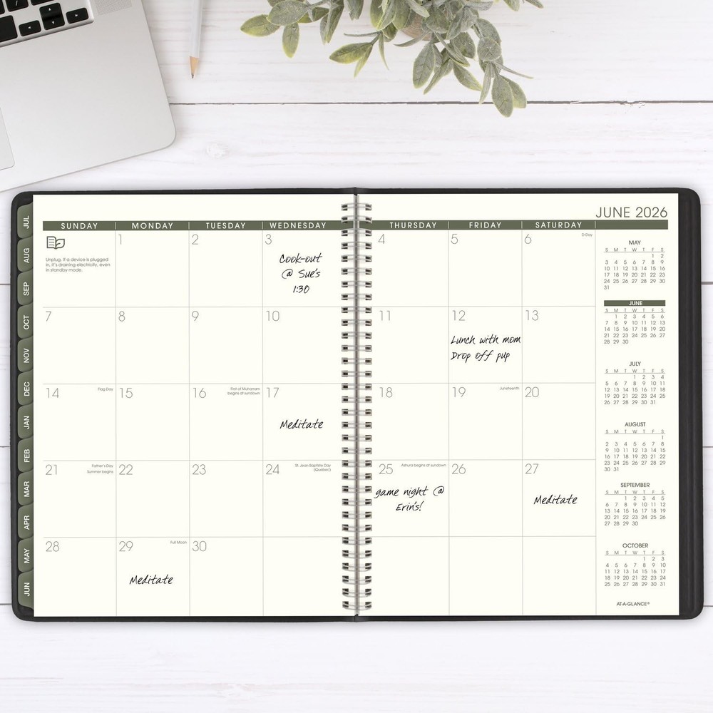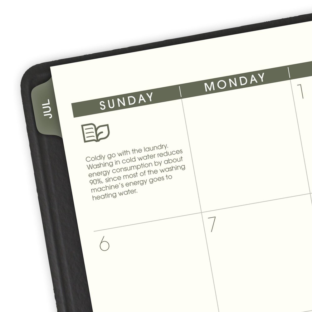 ACADEMIC PLANNING – Keep track of your schedule with an eco-friendly twist this year. Date range covers 12 months from July 2025 – June 2026 with Julian dates. GUARANTEED TO LAST ALL YEAR – ACCO Brands will replace any defective planner that is returned within one year from the date of purchase. This guarantee does not cover damage due to misuse or abuse. RECYCLED MATERIALS – Make an environmentally conscious choice. Contains 100% post-consumer waste recycled paper, 50% post-consumer waste recycled covers. Tips for green living included on every page. WEEKLY & MONTHLY OVERVIEWS – Weekly spreads have ruled quarter-hourly appointments weekdays 7:00 a.m. - 8:45 p.m. and Saturdays 7:00 a.m. - 5:30 p.m. Monthly spreads are unruled for open planning. 8-1/4" x 11" page size. ENHANCED ORGANIZATION – Special features include a 3-year reference calendar, 4 future planning pages, important dates, contacts pages and 16 notes pages PROFESSIONAL DESIGN – Planner has a black faux leather cover and twin wire binding to help prevent snags and secure pages