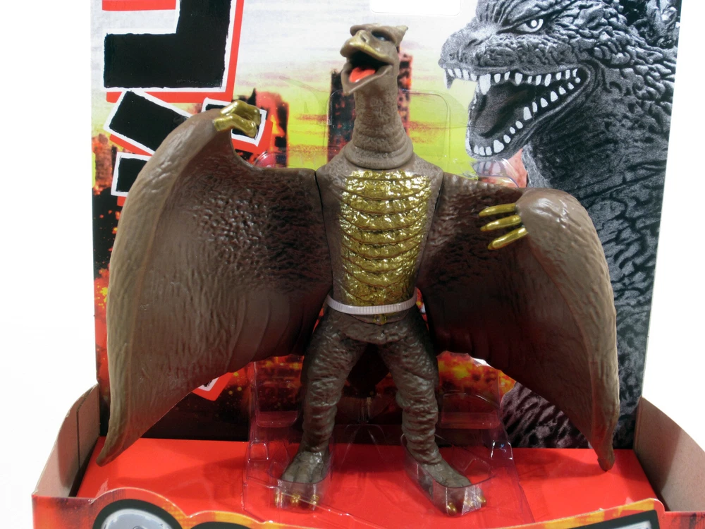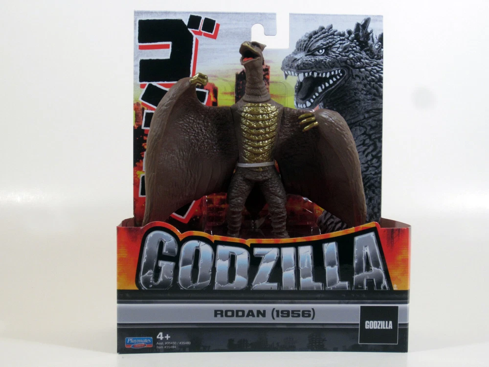 Figure is new in original packaging. Humans once again awaken a mighty creature, but this time it can fly at supersonic speeds! First-appearing in its title film in 1956, Rodan has become one of the most popular kaiju characters ever. Once at odds with Godzilla and then later appearing as an ally, it was this first form of Rodan that cemented the monster's place as the "giant monster of the sky."