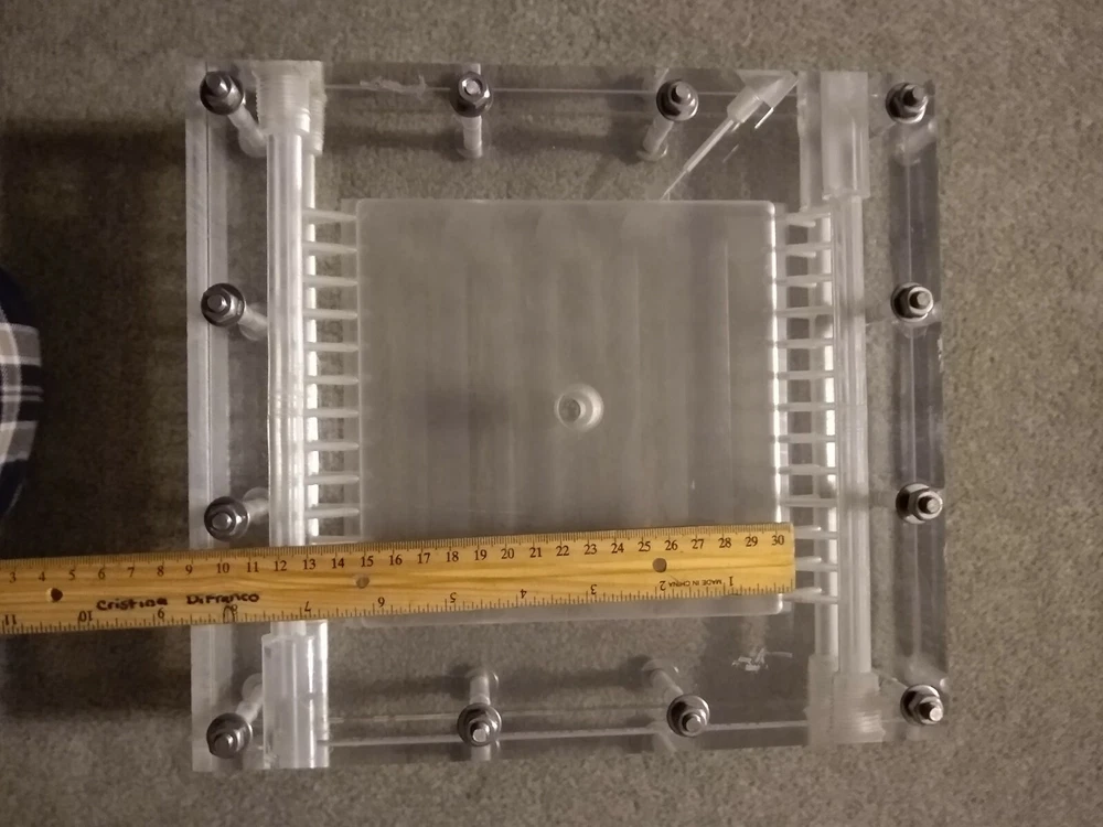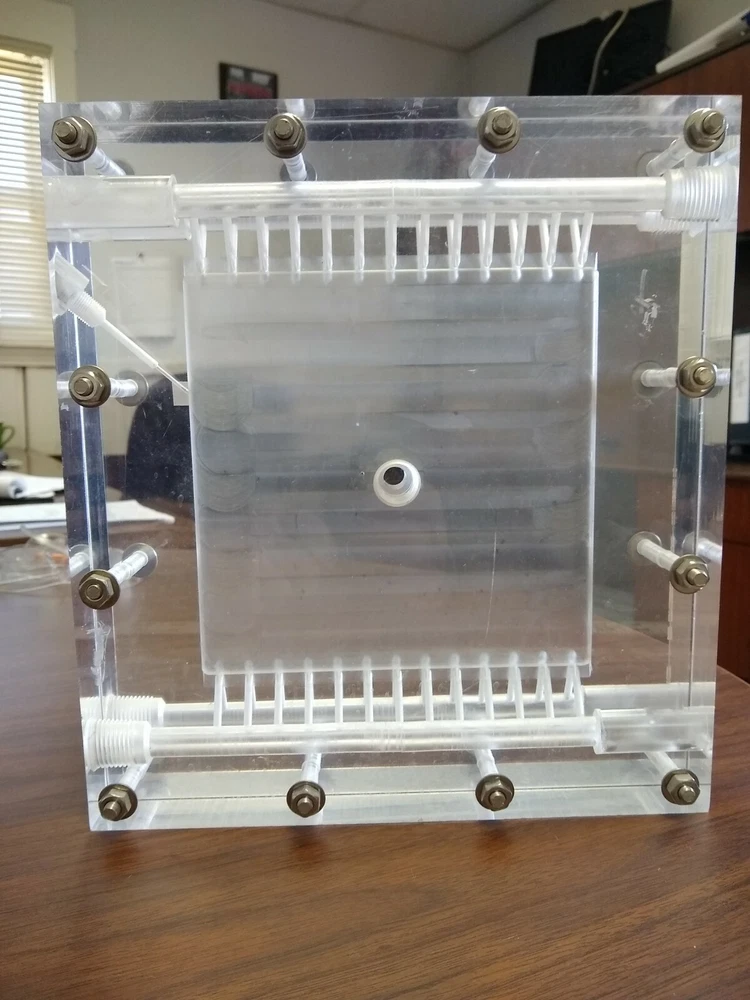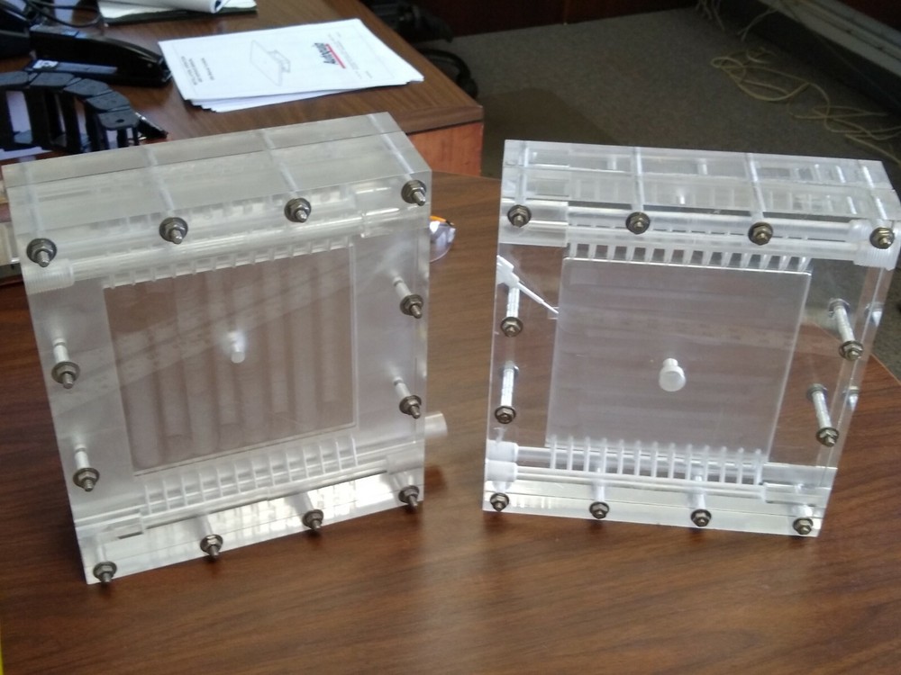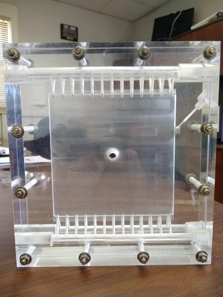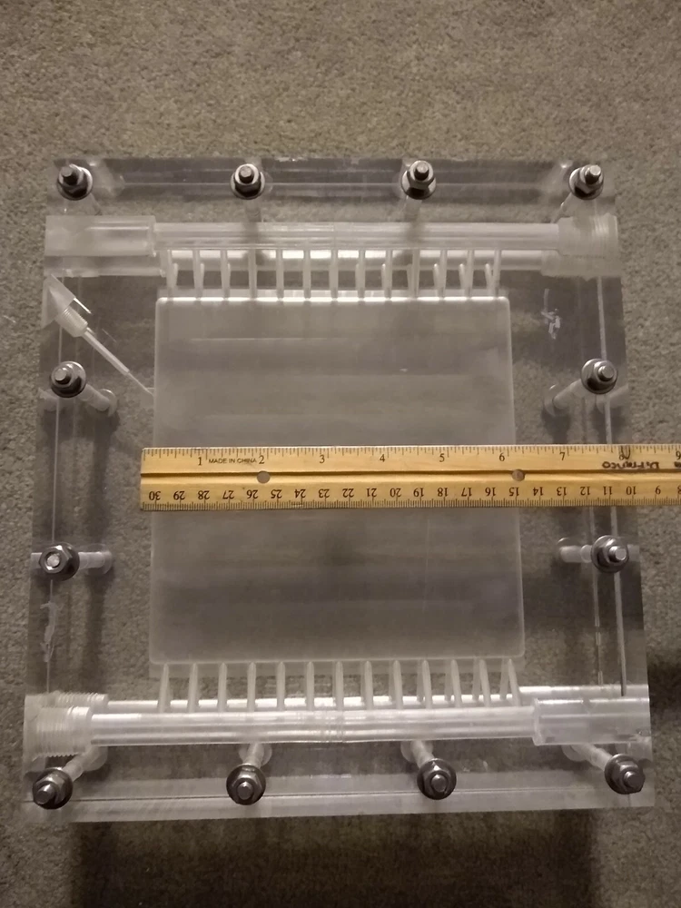 New, Never Used Machined from Clear Polycarbonate For use in lab testing GDE (Gas diffusion electrode) cell Fuel Cell Polymer Electrolyte Membrane Polymer Membrane Electrode Anode Cathode Reference Electrode Water Electrolysis Hydrogen Electrolysis Green hydrogen Bolted on the perimeter Reference electrode port Threaded connections Internally machines manifolds for liquid and gas distribution 11" x 10" cells (overall dimensions) 3" thick (not including bolts) 6.25" x 6.25" active area $800 each Two (2) available