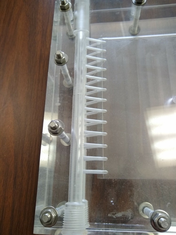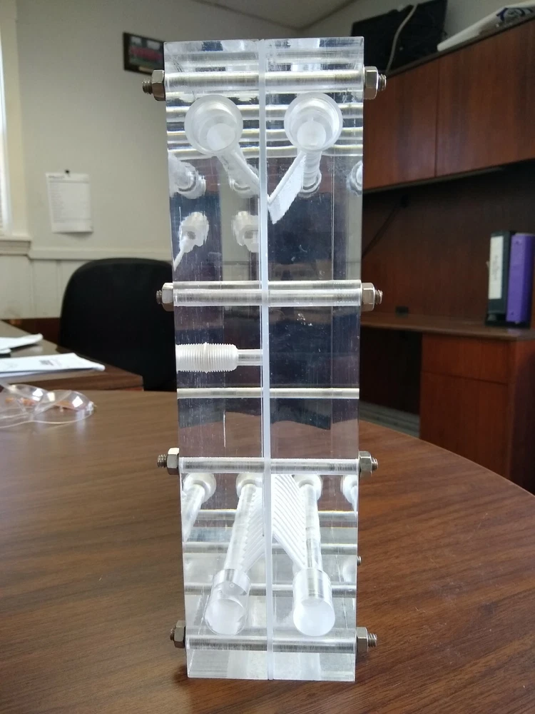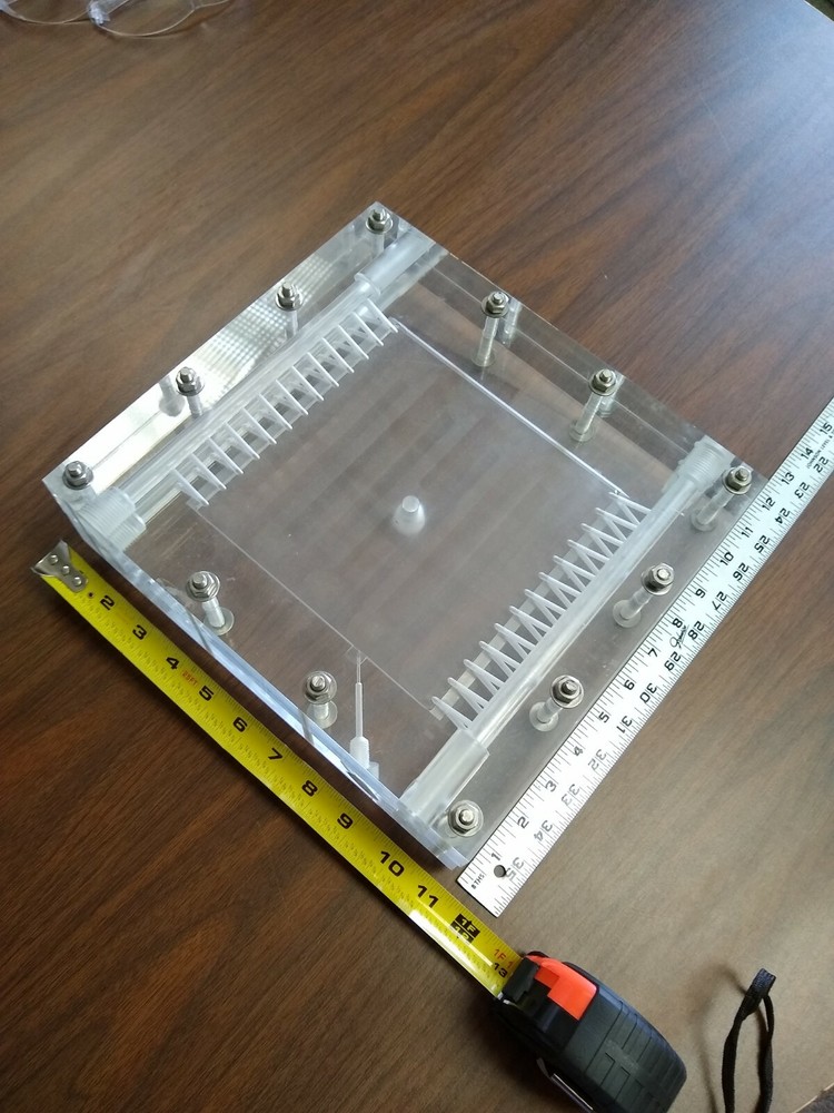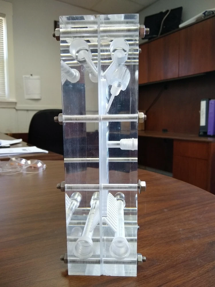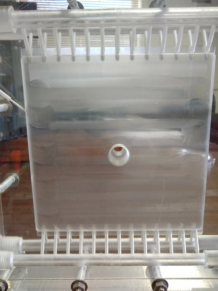 New, Never Used Machined from Clear Polycarbonate For use in lab testing GDE (Gas diffusion electrode) cell Fuel Cell Polymer Electrolyte Membrane Polymer Membrane Electrode Anode Cathode Reference Electrode Water Electrolysis Hydrogen Electrolysis Green hydrogen Bolted on the perimeter Reference electrode port Threaded connections Internally machines manifolds for liquid and gas distribution 11" x 10" cells (overall dimensions) 3" thick (not including bolts) 6.25" x 6.25" active area $800 each Two (2) available
