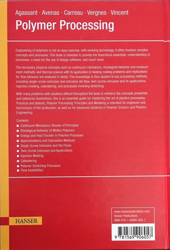Free Shipping in the United States Polymer Processing 2nd Edition Agassant, Avenas, Carrueau, Vergnes, Vincent Print Length: 884 pages ISBN-13: 978-1-56990-605-7 ISBN-10: 156990605X Publisher: Carl Hanser Verlag GmbH & Co. KG; 2 edition (August 7, 2017) Publication Date: August 7, 2017 Language: English eBook Bonus included