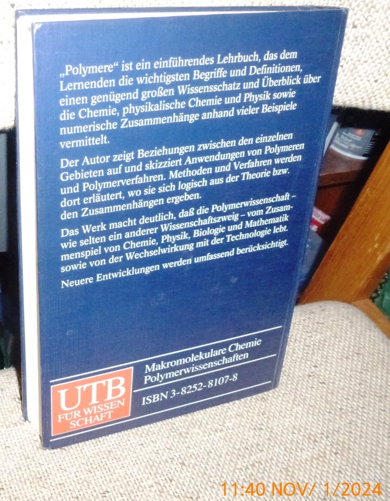 Polymere Von Monomeren und Makromolekülen zu Werkstoffen by Hans-Georg Elias ISBN Nr. 3-8252-8107-8 Hard bound 402 pages 153 illustrations and 54 tables German language book Used; this was a "work copy" by the author and I found a couple (4) small margin notes made by him (probably corrections) This book was published by my father (died in 2022) and was used by him as a work copy Domestic Shipping via USPS insured/tracked Ground Advantage or Priority Mail only --> Local pickup available in the northeast Dallas / Ft. Worth metro area.