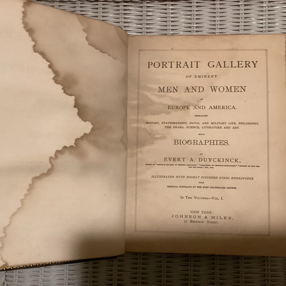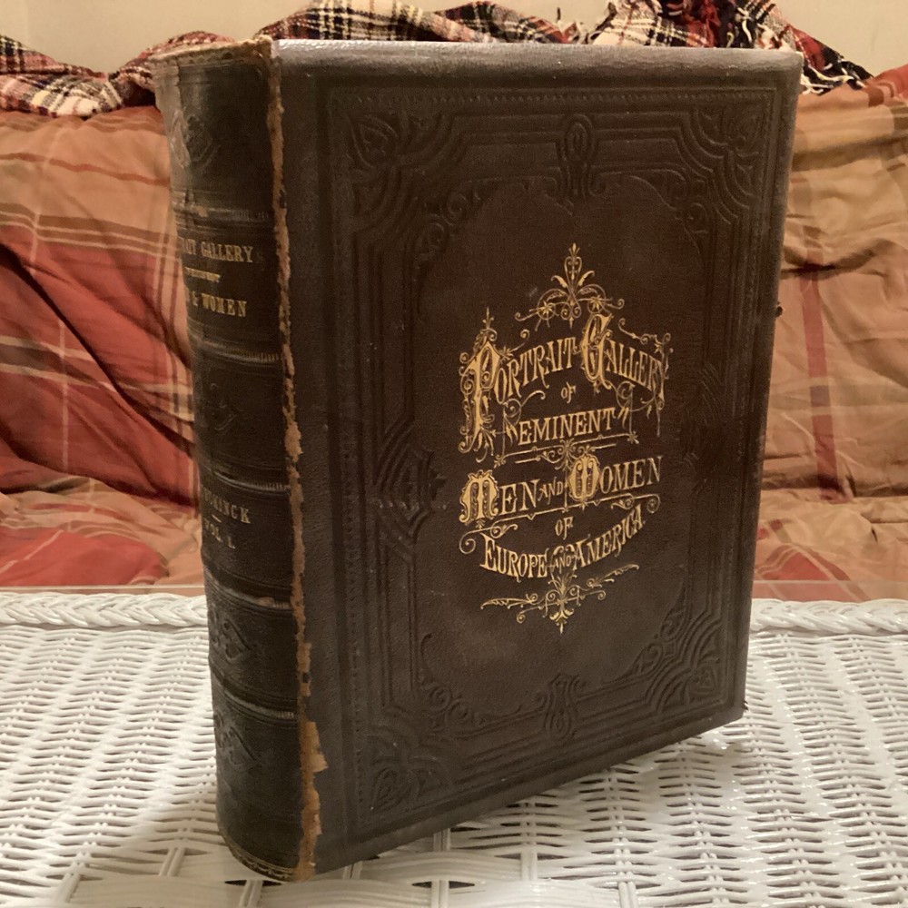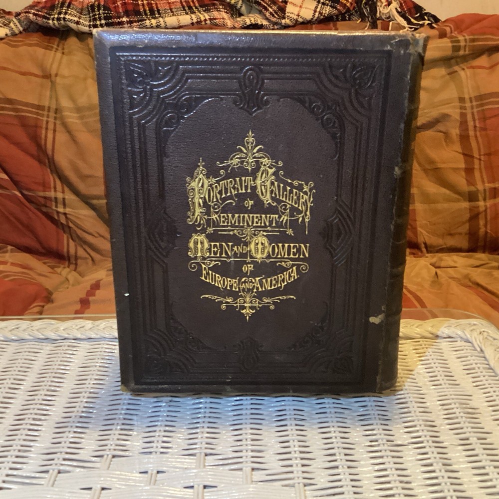 Portrait Gallery of Eminent Men and Women of Europe and America by Evert A. Duyckinck. 1878. Volume 1 of 2. Big leather bound book with gold gild decoration around pages and lettering on spine and front $ back cover. Book is in fair condition. Some staining on pages in front of book as seen in photos. And the hinge of the back cover is a little loose with staining as well as seen in photos, but book is still sturdy and readable. Book is a little over 11 inches tall, 9 inches wide, and almost 3 inches thick. Rare edition of this book with beautiful illustrations. Please look at photos for description and message me if you have any questions. Check out my other related antique books and unique listings Thank you for looking and be well!