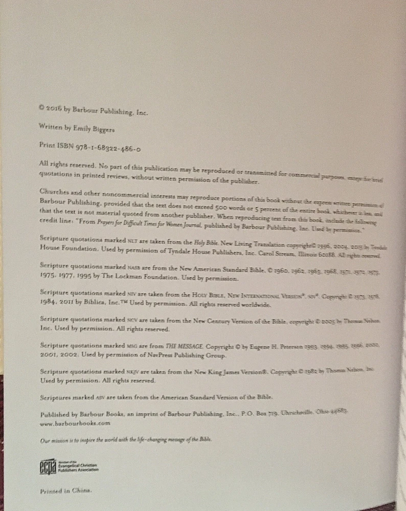 Get inspired with this deluxe journal titled "Prayers for Difficult Times for Women" includes many Bible verses for appropriate situations.,This nonfiction narrative type publication is published by Barbour Publishing, Incorporated and this is its luxury edition. The book has a publication year of 2016 and is written in English. This inspirational journal is faux leather bound and has full gilded page edges. Compiled by Barbour Staff, it has a total of 288 pages. The dimensions of the journal are 9-3/8" in length, 7" in width, and 1" thick. The book covers Christian life, prayer, and women's issues. It is a perfect devotional journal for women who want to stay inspired and motivated during difficult times. This journal, although Preowned , is like new. Shipped with USPS Media Mail.