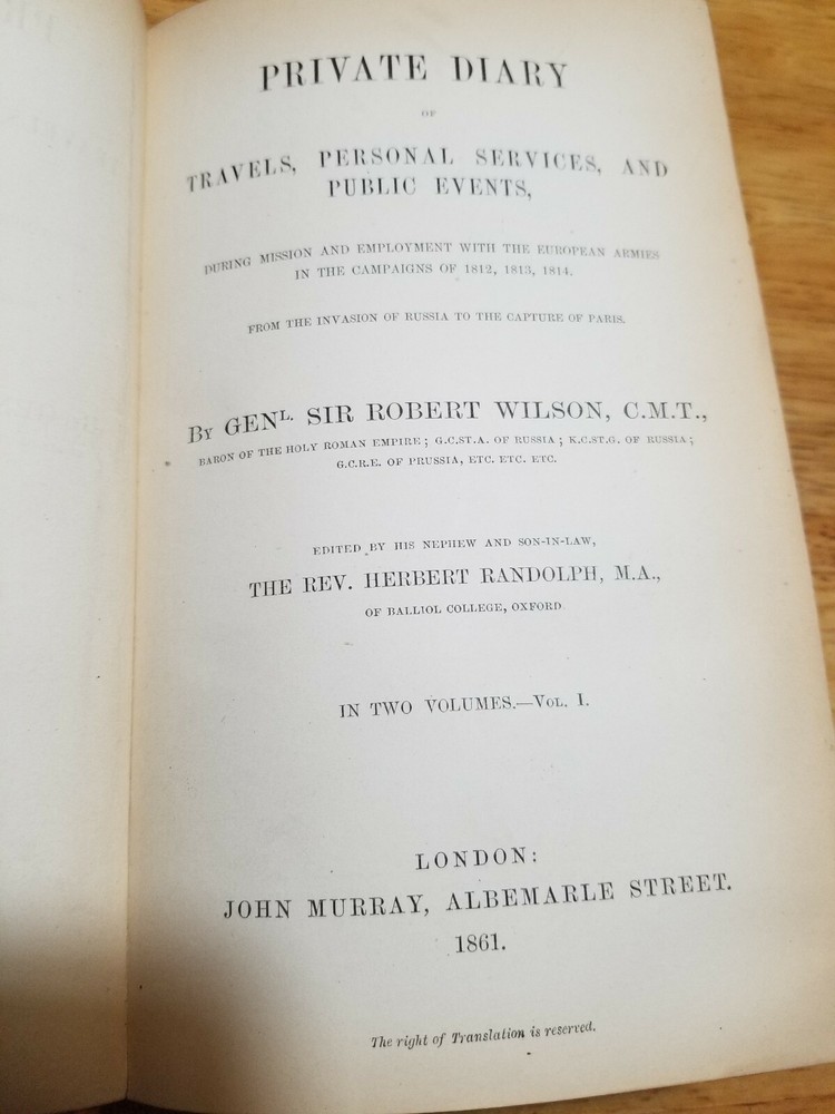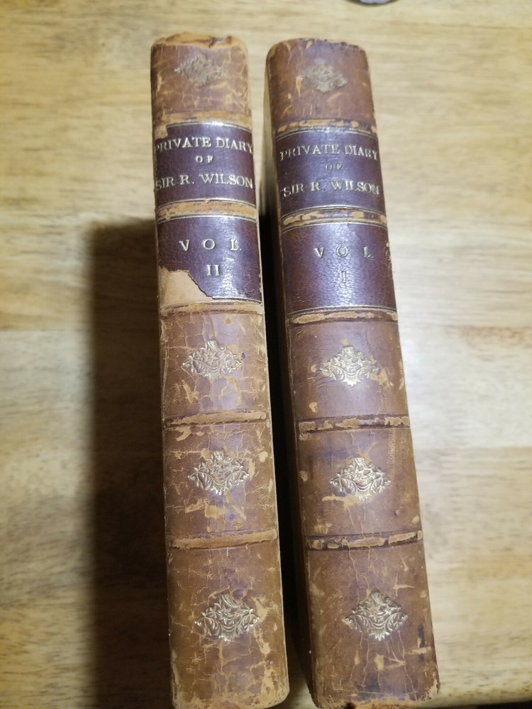 Private Diary of Sir Robert Wilson, John Murray, London, 1861. 2 Vols, half leather, five bands on spines. Map at rear of Vol. 1 intact and appears unopened. Books are solid, no cracking at hinges. Some wear to the edges of the boards and spine. Extraordinary record of Wilson’s journeys on behalf of the British government during the Napoleonic period. The diary covers his experiences in Spain, Austria, Sicily, Poland, Russia and elsewhere. He took an active part in battles as well as diplomacy. A good copy of a very rare book. Not ex-lib. $750