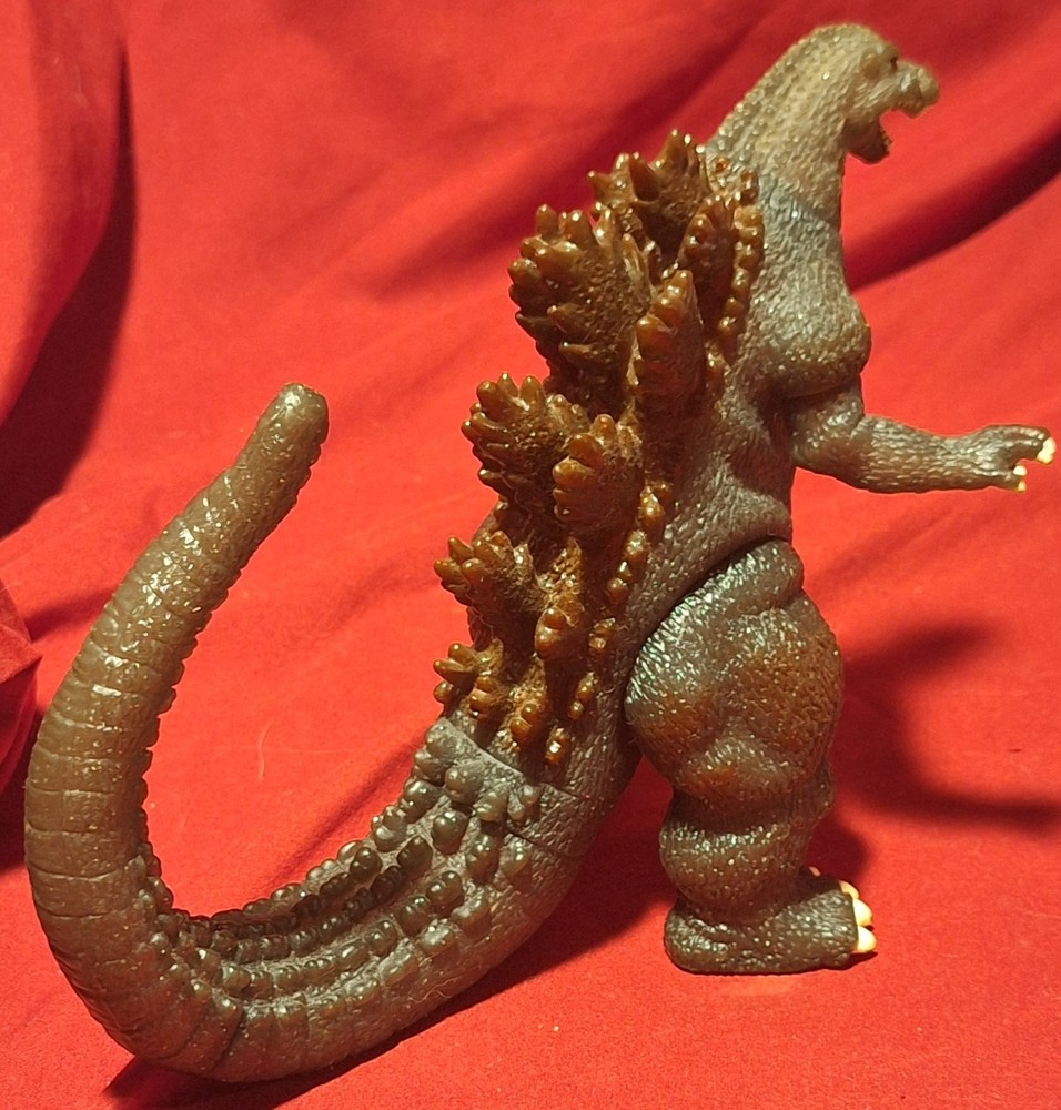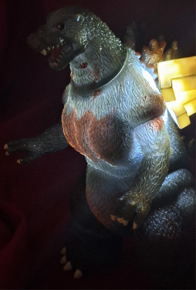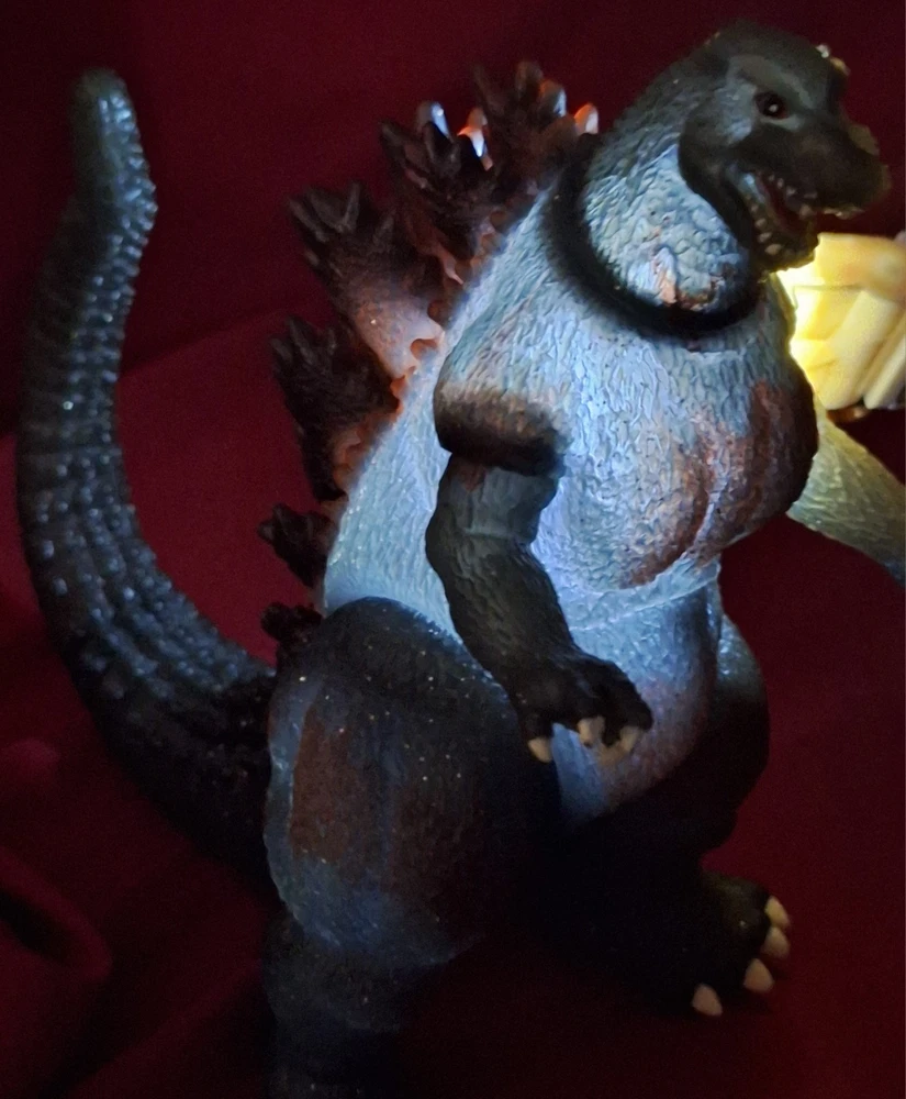A very interesting burning Godzilla figure from 2002! The last two photos are illuminated with a light to demonstrate the transparency of the material- no lights in figure.