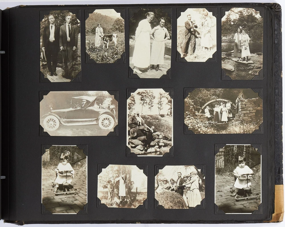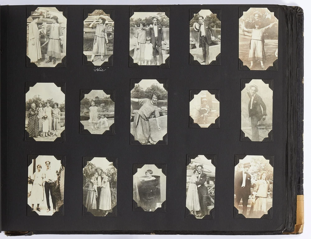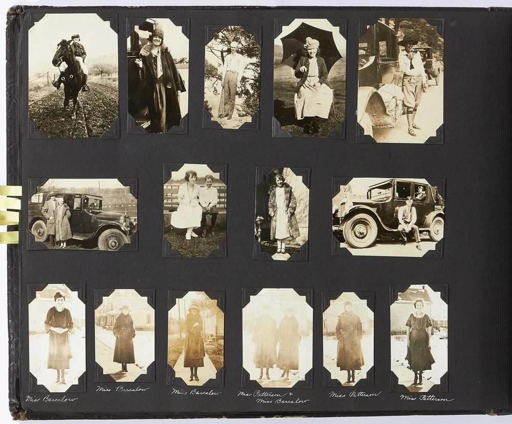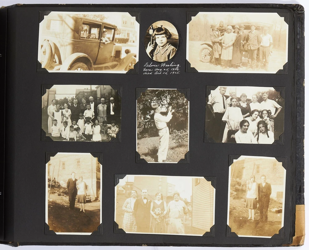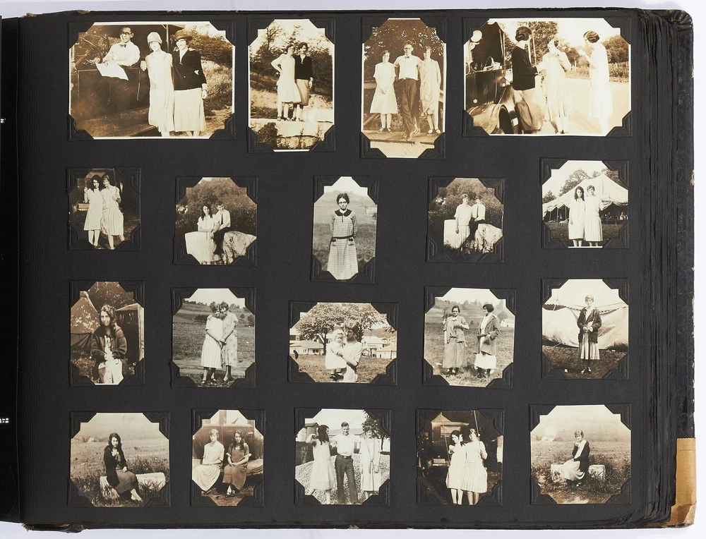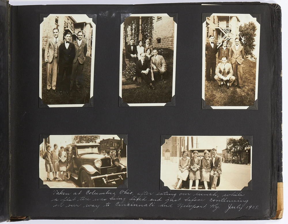 (Photo album): Extensive Family Photo Album of Travel, Fashion, and Nature in the 1920s-1930s Author: WAYNE, Rachel Elyada Title: (Photo album): Extensive Family Photo Album of Travel, Fashion, and Nature in the 1920s-1930s Publication: Pittsburgh, Pennsylvania / New York / Ohio: 1918-1930 Description: Softcover. Oblong quarto measuring 10" x 7". String tied, black leather over stiff paper boards. Contains 1,020 black and white gelatin silver or sepia toned photographs measuring between 0.5" x 0.5" and 5" x 4" with some captions. Some edgewear else near fine album with fine photographs. An abundant collection of family photographs from 1918 through to 1930 collected by Rachel Elyada Wayne. The photographs are well composed even including some photographs with intentional double exposures and diamond cut outs. Wayne's family lived in Pittsburgh, Pennsylvania occasionally traveling together on family vacations or adventuring with friends. The family often travels to various places in New York, Pennsylvania, and Ohio, with captions such as, "Taken at Columbus, Ohio after eating our lunch, when a flat tire was being fixed and just before committing on our way to Cincinnati and Newport, NY July 1928". There are several pictures of Wayne and her family visiting the state capital in New York and on Coney Island, camping trips in Vandergrift, Pennsylvania, and family reunions in Youngstown, Ohio. The traveling photos usually show the family's automobiles from the 1920s and pictures of their camping groups, Apollo Camp and Luchlurg Camp. They also visited different caves including Mammoth and Sand Cave in Kentucky. One family trip also shows a small plane crashed into the ground, smoke and flames caught by the camera. The photographs cover a wide span of the different family member's lives. There are pictures of babies and young children that later are shown as teenagers making funny faces, posing, or in one photo eating Cracker Jacks. There are a couple wedding photographs, pictures of family gatherings, posed outfit pictures, photos of people dancing, and one with an elderly couple pretending to battle with brooms. Small captions are written on photographs with the names of the children, "Che Che's Happy-go-lucky!" The album also mentions where some of the family members worked. A large group photo with Rachel Elyada Wayne and some of her family members is pictured with the caption "Pittsburgh Trust Co." as Rachel was a stenographer for the bank. There are also a couple photos of some of the young women in the Rickety Rackety Serenaders, a women's singing group and instrumental band. Included are several photographs of some of the young men in their military uniforms dated 1929. Some of the photographs are of animals and nature. A few of the photographs are of deer in the snow, the camping sites, and some of the boats in the rivers. There are also a couple pictures of a lightning storm, where the bolts of lightning can be seen in the photographs. An extensive collection of particularly aesthetically pleasing family photographs featuring nature, fashion, and travel during the 1920s through to the 1930s. Seller ID: 417814 Subject: Photography, Travel Books Between the Covers Between the Covers has been selling books for more than 30 years. Today we offer a wide ranging inventory, from Modern First Editions to General Used Books to Rare Archival Collections. We are active members of the Antiquarian Booksellers' Association of America (ABAA) and the International League of Antiquarian Booksellers (ILAB) . Terms All orders ship within two business days. Standard mail is USPS Media Mail. Expedited and international shipping are also available. We offer combined shipping on multiple orders. All books are guaranteed to be as described or they may be returned within 30 days of receipt for a full refund. This listing was created by Bibliopolis.