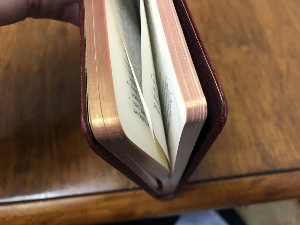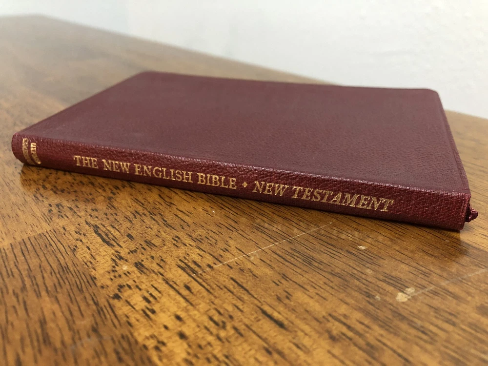 Oxford Cambridge NEB NT New English Bible Burgundy Leather Art Gilt 130H These are exceedingly rare, but over years and diligent searching I’ve acquired several of these and decided to part with them from my personal collection. This is a burgundy 130H NEB with the New Testament only. It features perhaps the most pleasant reading format available for the Bible, single column with a rather perfect character line count, with the verse numbers outside the text. This has what appears to me to be mint art gilding, except a tiny abrasion has perfect binding (it’s imitation leather and stiff), and has no writing I could find except the confirmation gift inscription on a blank intro page. Quite a few pages still stick. Talk about a diamond in the rough! $175 Black letter Reinforced sewn text block 6 x 4 x .4 Note: I always list any writing, stains, tears, or imperfection of any kind. Unlike the vast majority of sellers out there, I refuse to hide imperfections through cleverly taken pictures or obscure descriptions. I try to include as many pictures as necessary to highlight the imperfections rather than the beauty of the items, which is part of why I have an elevated Seller Status and perfect feedback in which many consistently report back “just as described” or “better than described.” If I miss something by accident, please contact me so I can make it right. My flawless feedback should speak for itself, but you won’t be disappointed! Thank you for your business and God bless!