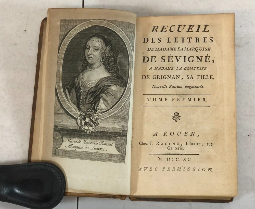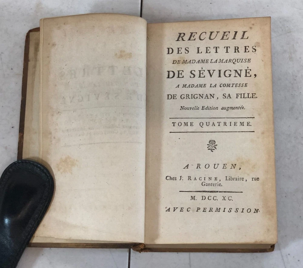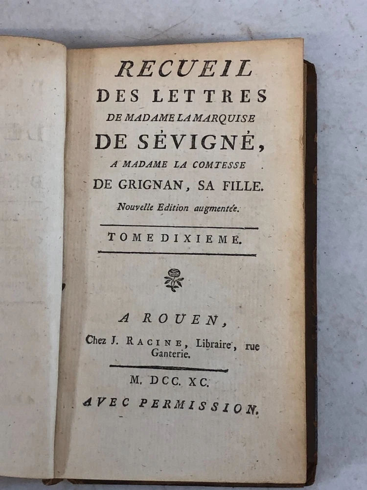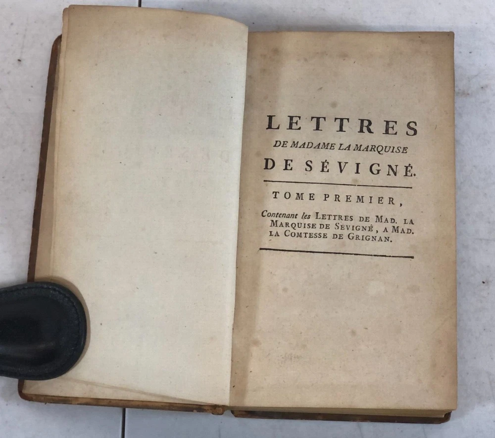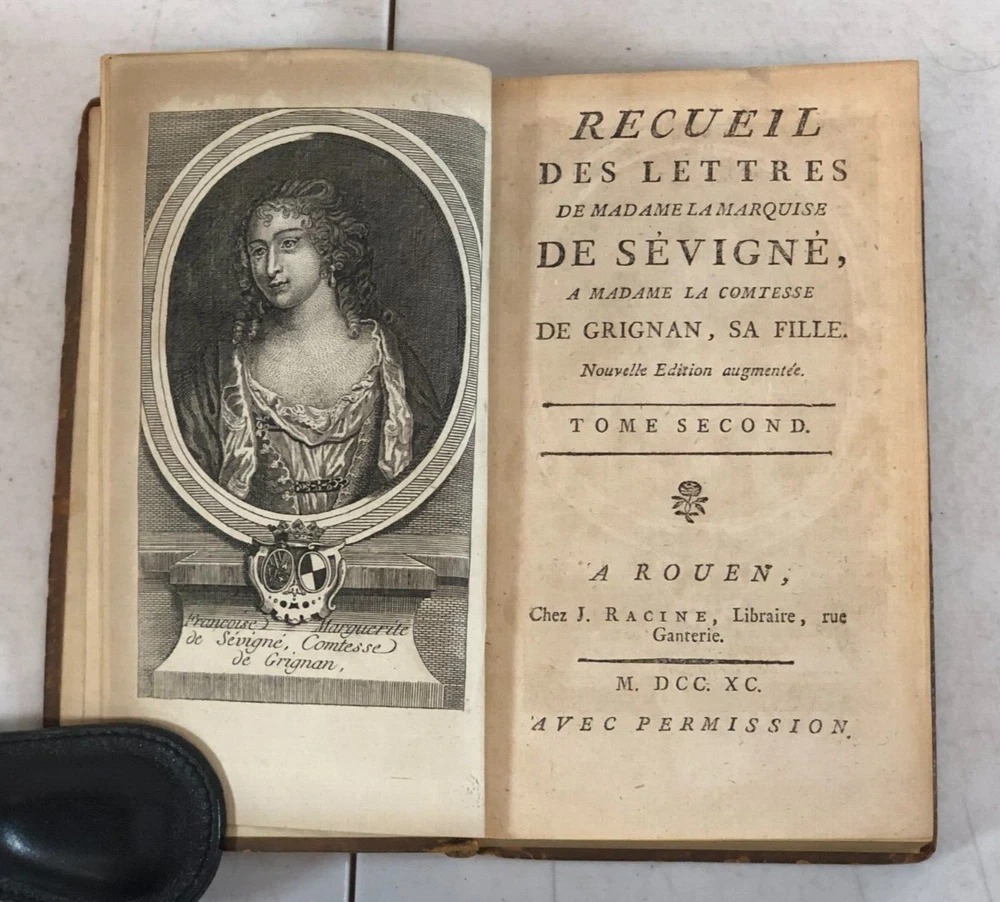 Please note we do not work weekends . All offers, questions, or concerns may not be answered until Monday. Please understand this means you may need to resubmit your offer Sunday evening. Thank you for supporting our libraries and have a great weekend. This is the complete 10 volume set published in 1790. Leather bound. Gilt lettering and design on spine. Old Library plate inside front cover. The pages and bindings are still tight. Recueil Des Lettres De Madame La Marquise De Sevigne, A Madame La Comtesse De Grignan, Sa Fille. Nouvelle Edition augmentee. A Rouen, Chez J. Ragine, Libraire, rue Ganterie M DCC XC AVEC Permission Collection of letters from Madame La Marquise de Sevigne, to Madame La Comtesse de Grignan, her daughter. New expanded edition. In Rouen, Chez J. Ragine, Bookseller, rue Ganterie M DCC XC 1790 WITH Permission Tome Premier, Contenant les Lettres De Mad. La Marquise De Sevigne, A Mad. La Comtesse De Grignan. Tome Second Contenant la Suite de ses Lettres A Mad. La Contesse De Grignan Tome Troisieme, Contenant la Suite de ses Lettres A Mad. La Comtesse De Grignan Tome Quatrieme Contenant la Suite de ses Lettres A Mad. Comtesse De Grignan Tome Cinquieme Contenant la Suite de ses Lettres A Mad. Comtesse De Grignan Tome Sixieme Contenant la Suite de ses Lettres A Mad. Comtesse De Grignan Tome Septieme Contenant la Suite de ses Lettres A Mad. Comtesse De Grignan Tome Huitieme Contenant le restant des Lettres De Mad, La Marquise De Sevigne A. Mad. La Comtesse De Grignan, et Celles De Mad. De Sevigne Au Comte De Bussy-RaButin, extraites du Recueil des Lettres de ce dernier Tome Neuvieme, Contenant le Recueil des Lettres Choisies, pour servir de Suite a celles de Mad. la Marquise de Sevigne a Mad. la Comtesee de Grignan. Tome Dixieme. Contenant les Nouvelles Lettres De Mad. La Marquise De Sevigne, Celles De Mad. La Marquise De Simiane, et la Table generale des Matieres. First Volume, Containing the Letters of Mad. The Marquise De Sevigne, A Mad. The Countess of Grignan. (spine is split and fragile, front cover is separating from book) Second Volume Containing the Continuation of his Letters To Mad. The Countess of Grignan Third Volume, Containing the Continuation of his Letters to Mad. Countess of Grignan Fourth Volume Containing the Continuation of his Letters to Mad. Countess of Grignan Fifth Volume Containing the Continuation of his Letters to Mad. Countess of Grignan Sixth Volume Containing the Continuation of his Letters to Mad. Countess of Grignan Seventh Volume Containing the Continuation of his Letters to Mad. Countess of Grignan Volume Eight Containing the remainder of the Letters of Mad, La Marquise De Sevigne A. Mad. The Countess of Grignan, and Those of Mad. From Sevigne To Count De Bussy-RaButin, extracted from the latter's Collection of Letters. Volume Nine, Containing the Collection of Selected Letters, to serve as a continuation of those of Mad. the Marquise de Sevigne has Mad. the County of Grignan. (front cover is becoming separated from book) Volume Ten Letters from Madame La Marquise de Sevigne. Containing the New Letters From Mad. The Marquise De Sevigne, Those of Mad. The Marquise De Simiane, and the General Table of Contents. (front cover and free edn sheet are separated from book) All proceeds benefit the Libraries of Pima County. Please review all photos. This listing has been donated. Please note that the listing is for what you see in the listing. We photograph all of it so you know what you are purchasing. The sale of the item(s) benefits Friends of the Pima Library (501c3 non-profit).