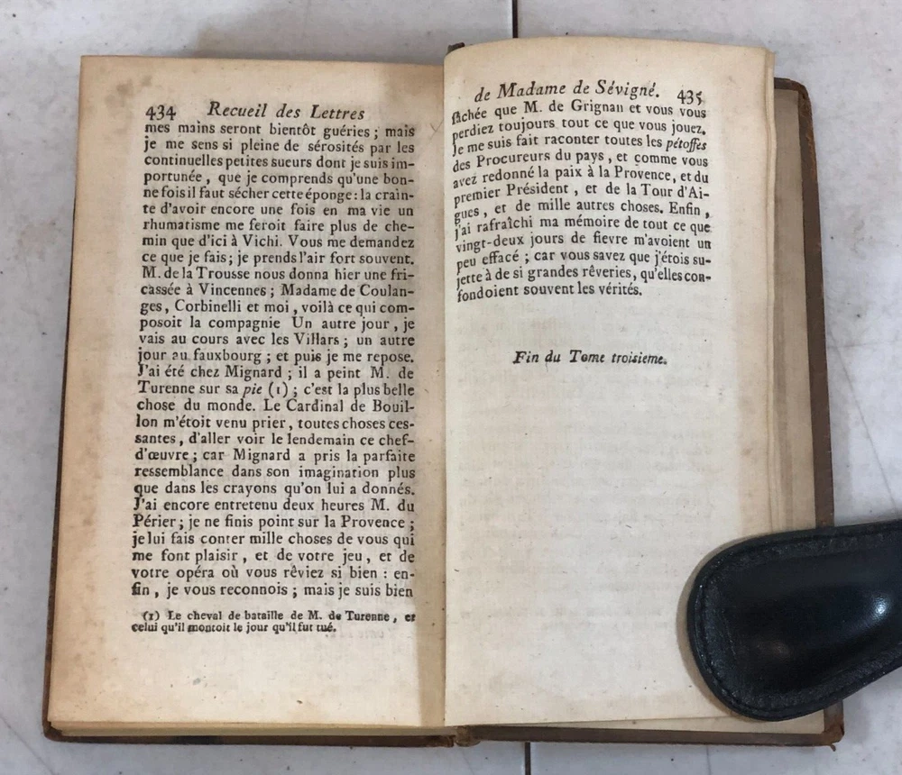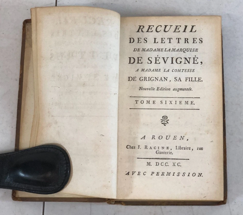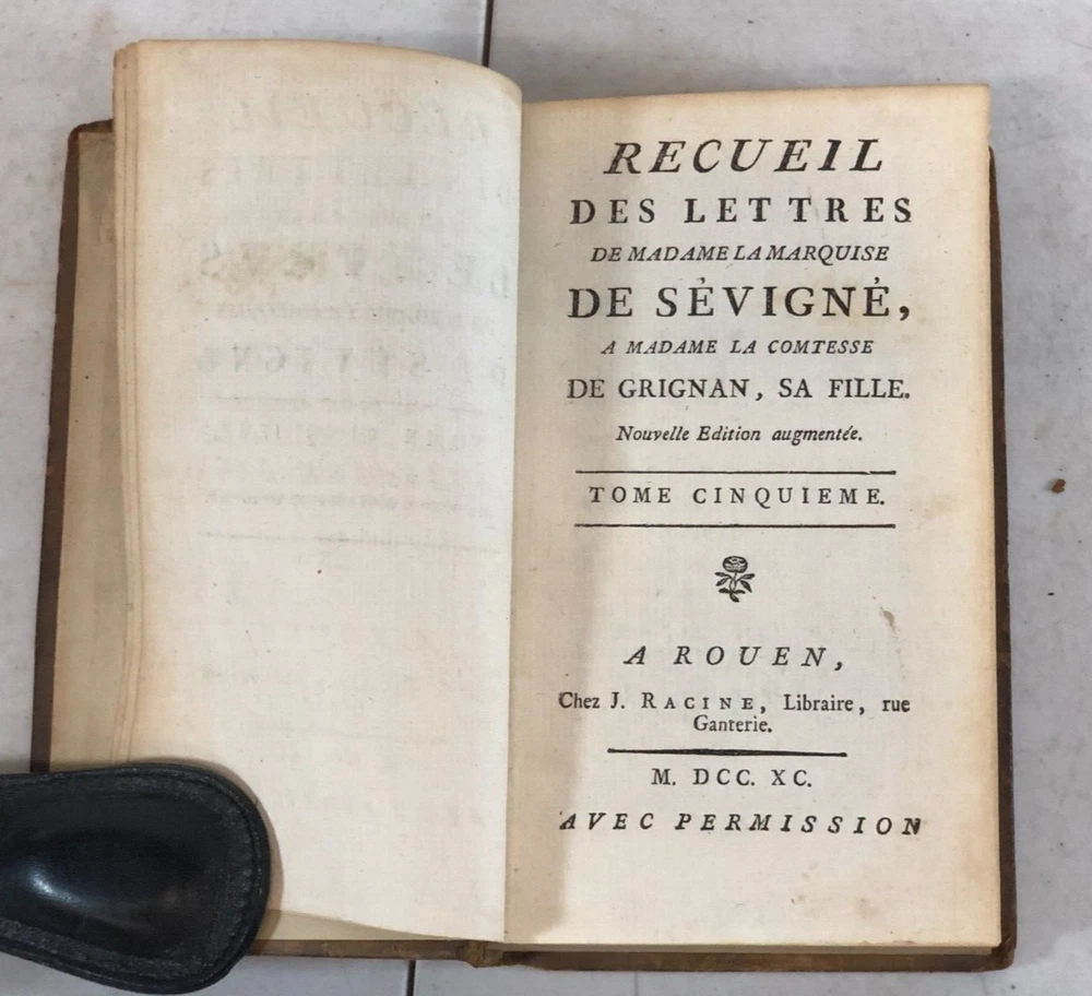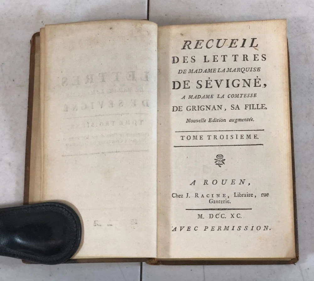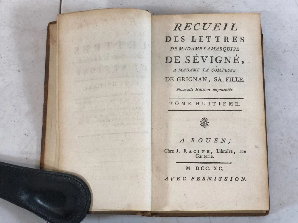 Please note we do not work weekends . All offers, questions, or concerns may not be answered until Monday. Please understand this means you may need to resubmit your offer Sunday evening. Thank you for supporting our libraries and have a great weekend. This is the complete 10 volume set published in 1790. Leather bound. Gilt lettering and design on spine. Old Library plate inside front cover. The pages and bindings are still tight. Recueil Des Lettres De Madame La Marquise De Sevigne, A Madame La Comtesse De Grignan, Sa Fille. Nouvelle Edition augmentee. A Rouen, Chez J. Ragine, Libraire, rue Ganterie M DCC XC AVEC Permission Collection of letters from Madame La Marquise de Sevigne, to Madame La Comtesse de Grignan, her daughter. New expanded edition. In Rouen, Chez J. Ragine, Bookseller, rue Ganterie M DCC XC 1790 WITH Permission Tome Premier, Contenant les Lettres De Mad. La Marquise De Sevigne, A Mad. La Comtesse De Grignan. Tome Second Contenant la Suite de ses Lettres A Mad. La Contesse De Grignan Tome Troisieme, Contenant la Suite de ses Lettres A Mad. La Comtesse De Grignan Tome Quatrieme Contenant la Suite de ses Lettres A Mad. Comtesse De Grignan Tome Cinquieme Contenant la Suite de ses Lettres A Mad. Comtesse De Grignan Tome Sixieme Contenant la Suite de ses Lettres A Mad. Comtesse De Grignan Tome Septieme Contenant la Suite de ses Lettres A Mad. Comtesse De Grignan Tome Huitieme Contenant le restant des Lettres De Mad, La Marquise De Sevigne A. Mad. La Comtesse De Grignan, et Celles De Mad. De Sevigne Au Comte De Bussy-RaButin, extraites du Recueil des Lettres de ce dernier Tome Neuvieme, Contenant le Recueil des Lettres Choisies, pour servir de Suite a celles de Mad. la Marquise de Sevigne a Mad. la Comtesee de Grignan. Tome Dixieme. Contenant les Nouvelles Lettres De Mad. La Marquise De Sevigne, Celles De Mad. La Marquise De Simiane, et la Table generale des Matieres. First Volume, Containing the Letters of Mad. The Marquise De Sevigne, A Mad. The Countess of Grignan. (spine is split and fragile, front cover is separating from book) Second Volume Containing the Continuation of his Letters To Mad. The Countess of Grignan Third Volume, Containing the Continuation of his Letters to Mad. Countess of Grignan Fourth Volume Containing the Continuation of his Letters to Mad. Countess of Grignan Fifth Volume Containing the Continuation of his Letters to Mad. Countess of Grignan Sixth Volume Containing the Continuation of his Letters to Mad. Countess of Grignan Seventh Volume Containing the Continuation of his Letters to Mad. Countess of Grignan Volume Eight Containing the remainder of the Letters of Mad, La Marquise De Sevigne A. Mad. The Countess of Grignan, and Those of Mad. From Sevigne To Count De Bussy-RaButin, extracted from the latter's Collection of Letters. Volume Nine, Containing the Collection of Selected Letters, to serve as a continuation of those of Mad. the Marquise de Sevigne has Mad. the County of Grignan. (front cover is becoming separated from book) Volume Ten Letters from Madame La Marquise de Sevigne. Containing the New Letters From Mad. The Marquise De Sevigne, Those of Mad. The Marquise De Simiane, and the General Table of Contents. (front cover and free edn sheet are separated from book) All proceeds benefit the Libraries of Pima County. Please review all photos. This listing has been donated. Please note that the listing is for what you see in the listing. We photograph all of it so you know what you are purchasing. The sale of the item(s) benefits Friends of the Pima Library (501c3 non-profit).