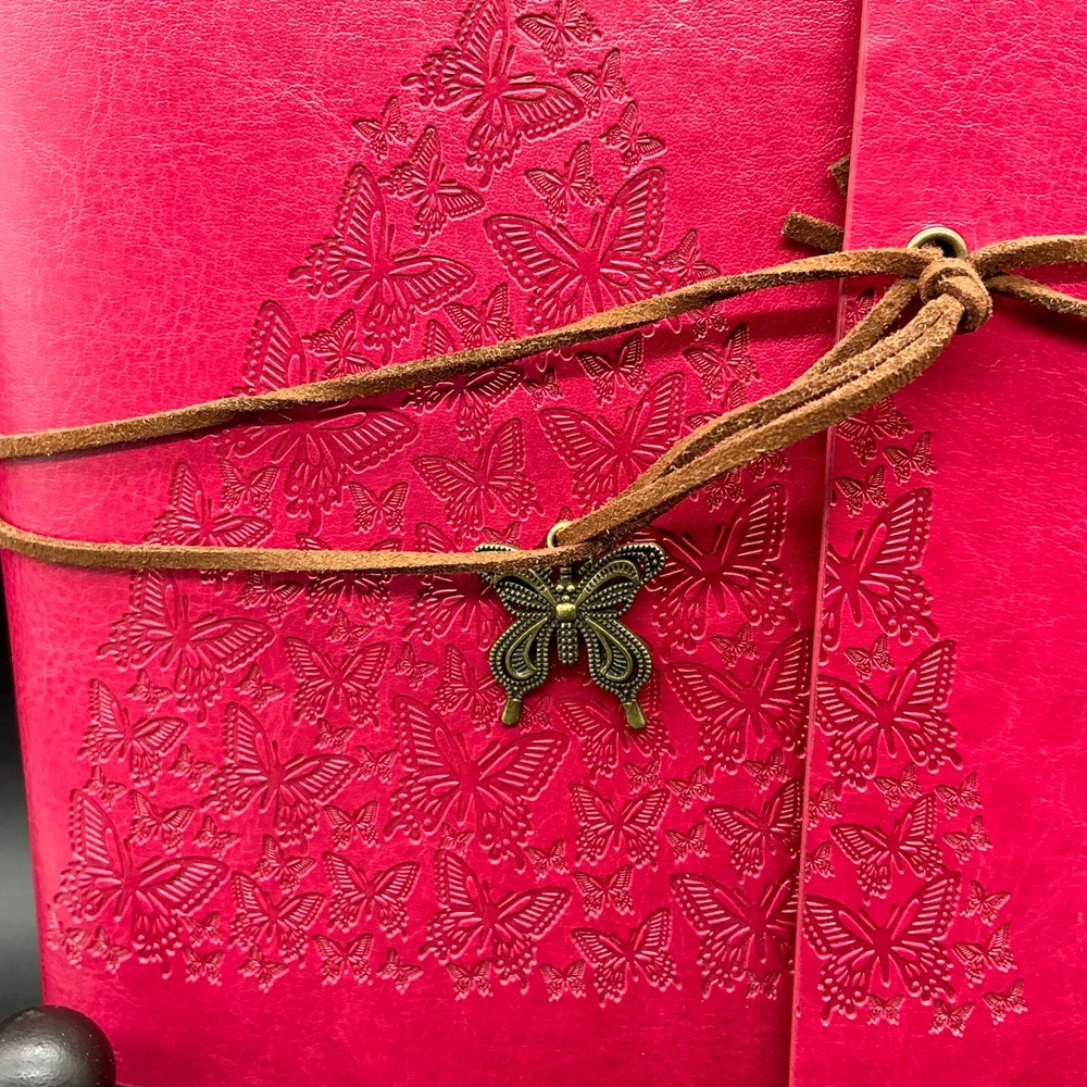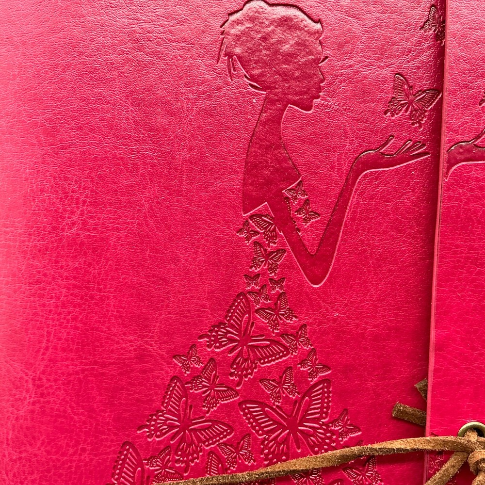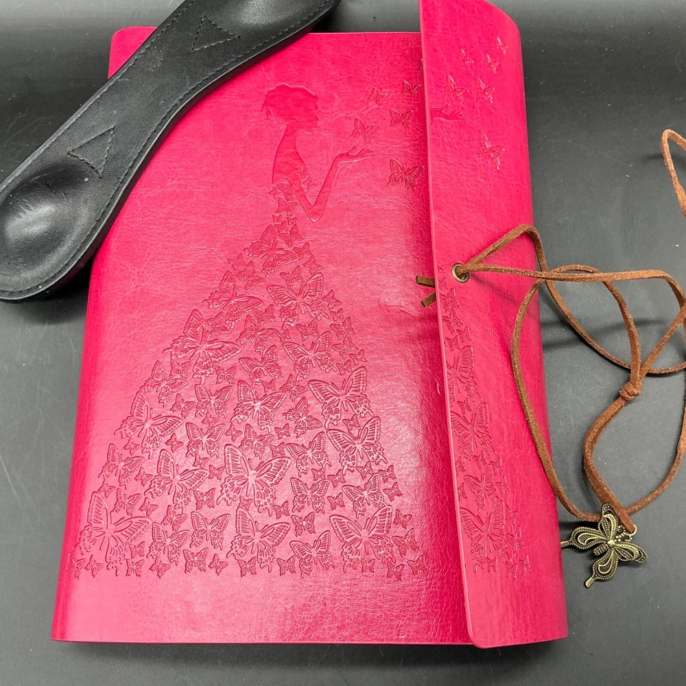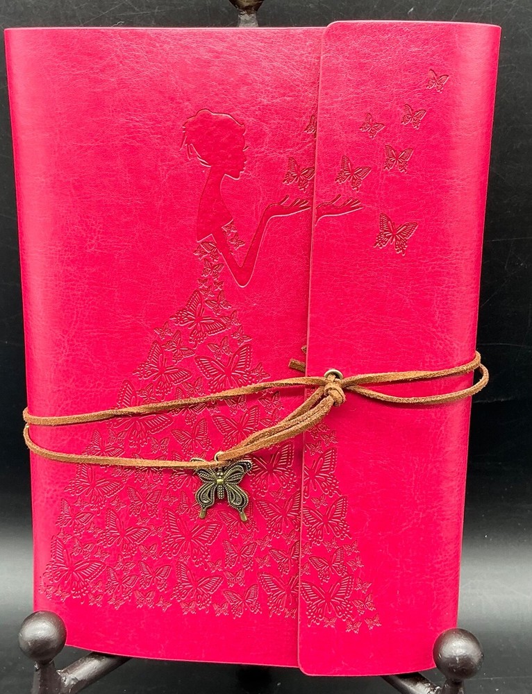 This preowned but new lovely Modana 9” X 7” red leather journal notebook has embossed butterflies as the skirt of a young girl’s gown and flying from her hand. The brown leather wrap cord has a butterfly charm. The journal is spiral bound and has one pack of lined paper and a sealed lined paper refill. Ships ground advantage USPS.