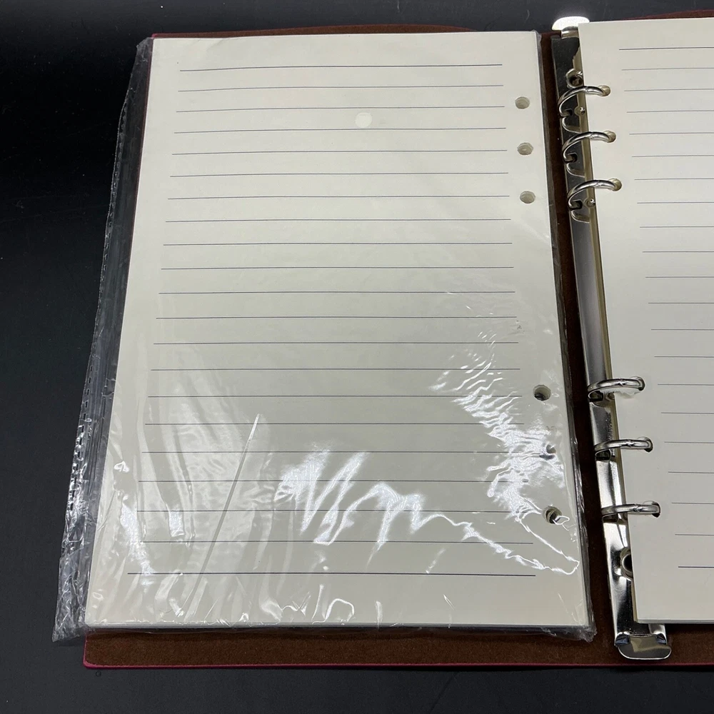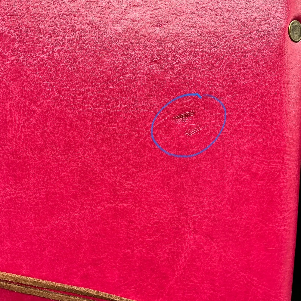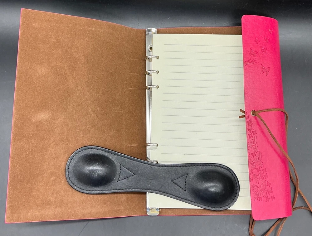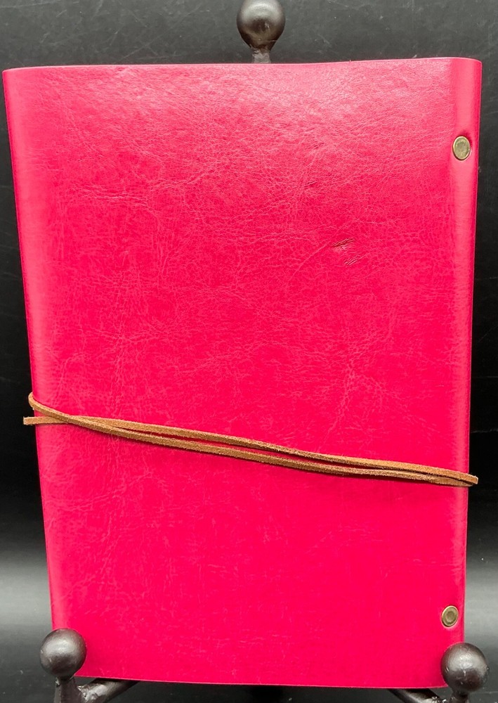 This preowned but new lovely Modana 9” X 7” red leather journal notebook has embossed butterflies as the skirt of a young girl’s gown and flying from her hand. The brown leather wrap cord has a butterfly charm. The journal is spiral bound and has one pack of lined paper and a sealed lined paper refill. Ships ground advantage USPS.