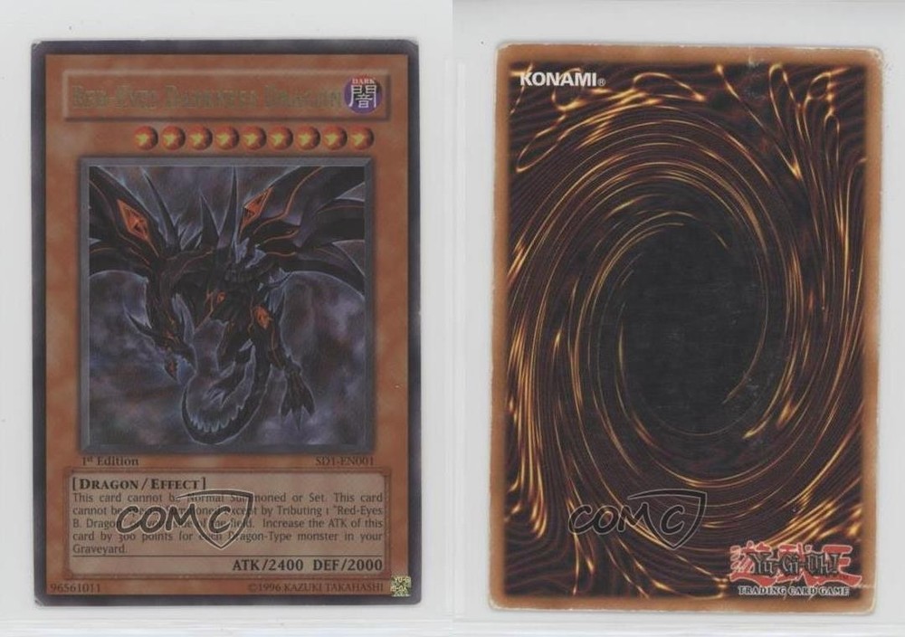 2005 Yu-Gi-Oh! Dragon's Roar - Structure Deck [Base] - 1st Edition #SD1-EN001 Red-Eyes Darkness Dragon COMC Item: 105004895 - YuGiOh Card - Featuring Red-Eyes Darkness Dragon Search for more: 2005 Yu-Gi-Oh! Dragon's Roar Search for more: 2005 Yu-Gi-Oh! Dragon's Roar - Structure Deck [Base] - 1st Edition View all of our Listings Auctions Buy It Now About Us Located in the beautiful Pacific Northwest, COMC (Check Out My Cards) is the world's largest consignment service for trading card singles. More than 10,000 people have used our consignment service to list over 50 million trading cards. Find out how we can help you consign your items on eBay by contacting us through eBay messaging. COMC -- "The Safe & Easy Way to Buy & Sell" Raw Condition for Modern Cards Unless otherwise noted, raw modern cards are listed in Near Mint-Mint condition or better. A NM-MT card appears to be Mint at first glance, but upon closer inspection, may exhibit some of the following: minor print defects (e.g. roller marks, print line, dimple), minor scratches, slight edge wear, and slight corner wear. Centering is clearly visible in the images provided and does not factor into our condition assessment. Raw Condition for Vintage Cards Unless otherwise noted, raw vintage cards are listed in Excellent condition or better. An EX card may exhibit some of the following: minor rounding of corners, surface wear, print defects, light scratches, and slight edge wear/chipping. Centering is clearly visible in the images provided and does not factor into our condition assessment. Domestic Shipping Combined shipping for multiple items is available. To receive combined shipping, please ensure all desired items are in your eBay shopping cart before proceeding to checkout. eBay limits orders to 40 items per order. We automatically combine multiple orders placed on the same day. If you place multiple orders on the same day, please contact us to request a refund of applicable shipping costs. Signature confirmation may be required on invoices over $400. All cards are protected and shipped securely. International Shipping COMC offers eBay's International Shipping (EIS) for international orders under $2,500* (see country exceptions below). All duties and import fees are paid at checkout; in the rare event that there are additional import fees upon delivery, these are borne by the buyer. EIS packages route through a shipping hub in Erlanger, KY before shipping to their final destination. Please note that EIS does not allow for combined shipments. The shipping rates are determined by eBay and cannot be adjusted. *Maximum sale price exceptions: Colombia, Kuwait ($2,000); Taiwan ($1,539); Chile, Costa Rica, Guatemala, Honduras, Trinidad and Tobago ($1,000); Antigua and Barbuda, Aruba, Belize, Dominica, Grenada, Philippines, Saint Kitts and Nevis, Saint Lucia, Montserrat, Turks and Caicos Islands ($500); Dominican Republic, El Salvador ($200). Please request a shipping quote through eBay messaging for orders that exceed the maximum sale price supported by eBay's International Shipping. You will be responsible for all duties and import fees for international orders shipped outside the EIS. All cards are protected and shipped securely. Payment COMC does not accept offers on our cards through our eBay storefront. COMC utilizes eBay’s managed payments system. If you are experiencing difficulties making a payment, please contact eBay for assistance. Return Policy Returns are only accepted on the rare occasion the item is not as described. If you are making a return, please initiate the return process through eBay so a mailing label can be provided for you. Prior to listing, our expert team carefully assessed this item to represent it accurately. Please review the description and high-definition images prior to purchasing to ensure this item meets your satisfaction. We welcome you to contact us if you have further questions about this item. Trust and Integrity COMC carefully assesses each item consigned to us to prevent fraudulent items from entering the marketplace. If you believe an item offered on COMC may be fraudulent, please contact us with details so we can investigate the issue. Items we determine are outside our supported items policy may be removed. Last Modified: 5/27/2025 8:43:33 PM PDT