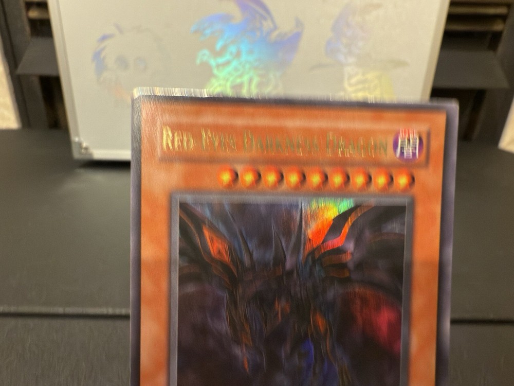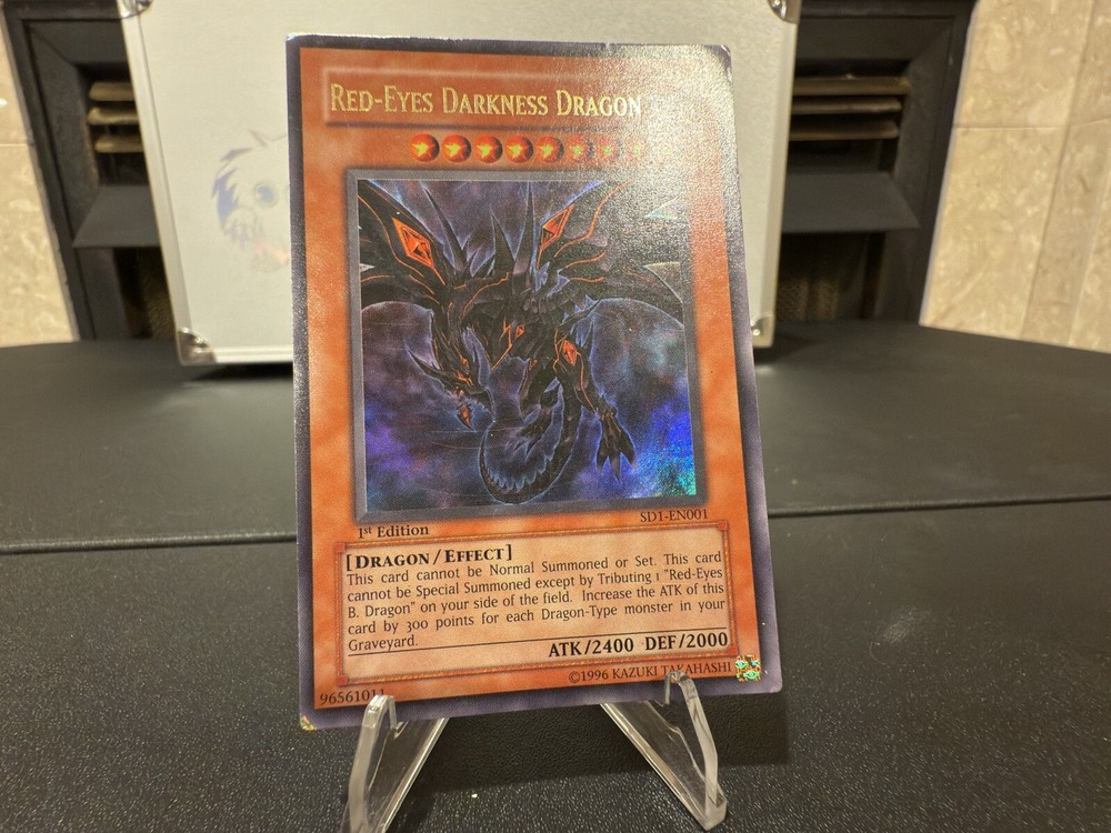 The "Red-Eyes Darkness Dragon" is an Ultra Rare English card from the Structure Deck: Dragon's Roar for the Yu-Gi-Oh! Trading Card Game. Manufactured by Konami, this 1st Edition card has the attributes of being Dark in color, having a power of 2400 and a toughness of 2000. As a Dragon-type monster with an Effect card type, it is a powerful addition to any player's deck, particularly for those focusing on Dragon-themed strategies.