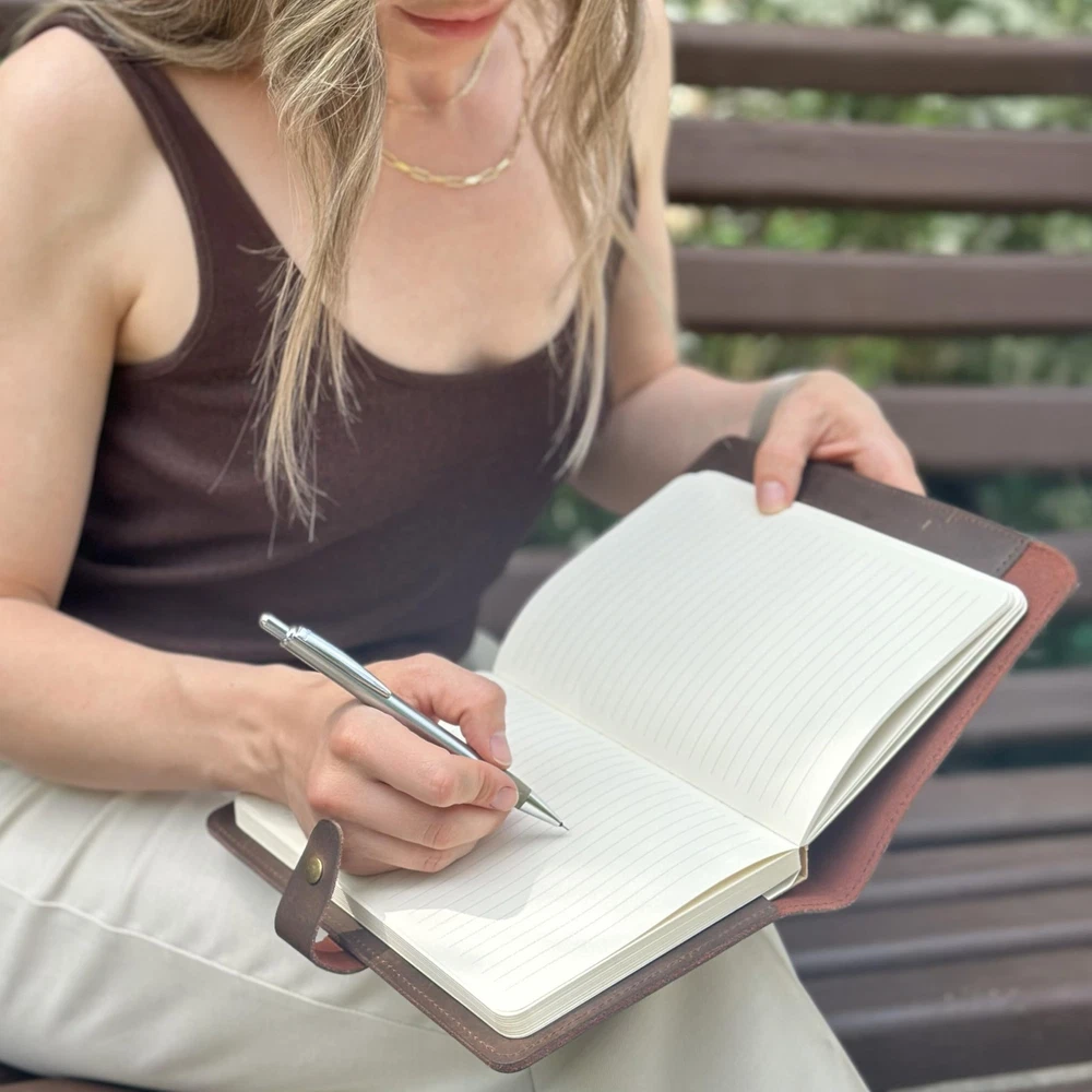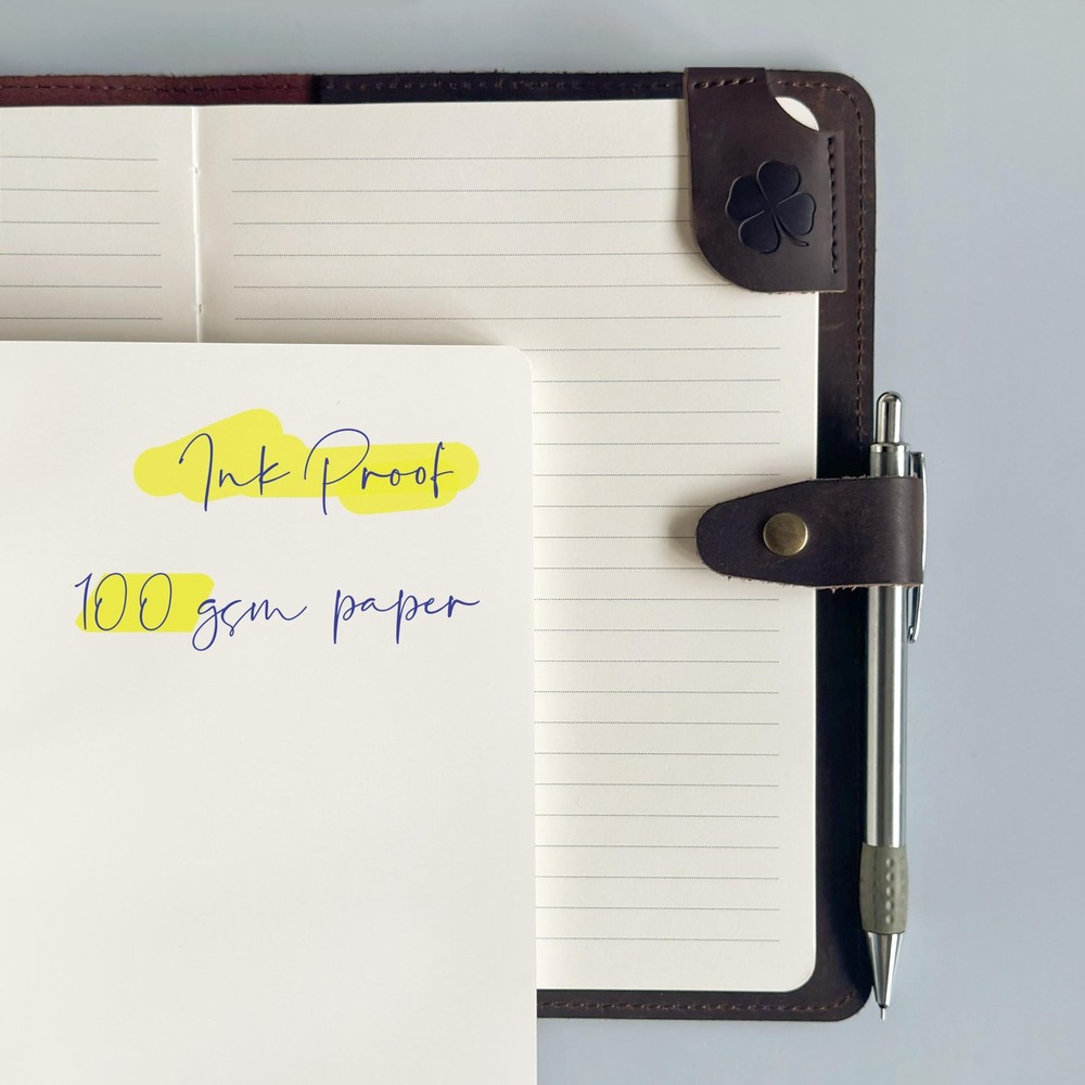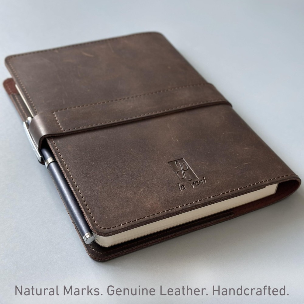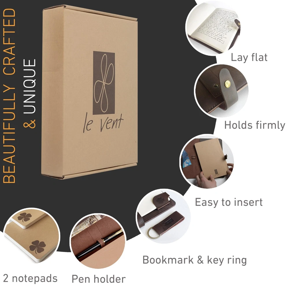 Discover an all-in-one solution with our A5 notebook cover set. Inside the box, you'll find an A5 notebook cover along with lined and blank notebooks, each containing 200 pages. Whether you're sketching, journaling, or planning, this versatile set has you covered. Additionally, enjoy the convenience of a leather bookmark and a leather key ring included in the set. This makes it a stylish and practical gift suitable for professionals, entrepreneurs, students, and creative individuals alike. With its durable construction and elegant design, this set is perfect for anyone seeking organization and inspiration in their daily life. Crafted to Endure – Crafted from genuine vintage leather, this leather journal refillable includes two 200-page A5 notebooks and a snap closure—built to last and made for everyday use. Write Without Waste – The refillable leather journal saves money and waste—just swap A5 notebooks when full. Thick 100gsm paper prevents ink bleed and keeps notes neat and professional. Flat-Lay Functionality – A structured journal leather with flat-lay binding solves the hassle of flimsy covers. Perfect for meetings, writing, or daily planning without distraction. Smart Interior Design – Designed for productivity, this notebook leather includes a pen loop, inner pocket, and card slots—everything you need, all in one organized place. Gift-Ready Elegance – The perfect gift set: this leatherbound notebook journal comes with a leather keychain, bookmark, and gift box—professional, thoughtful, and ready to impress.