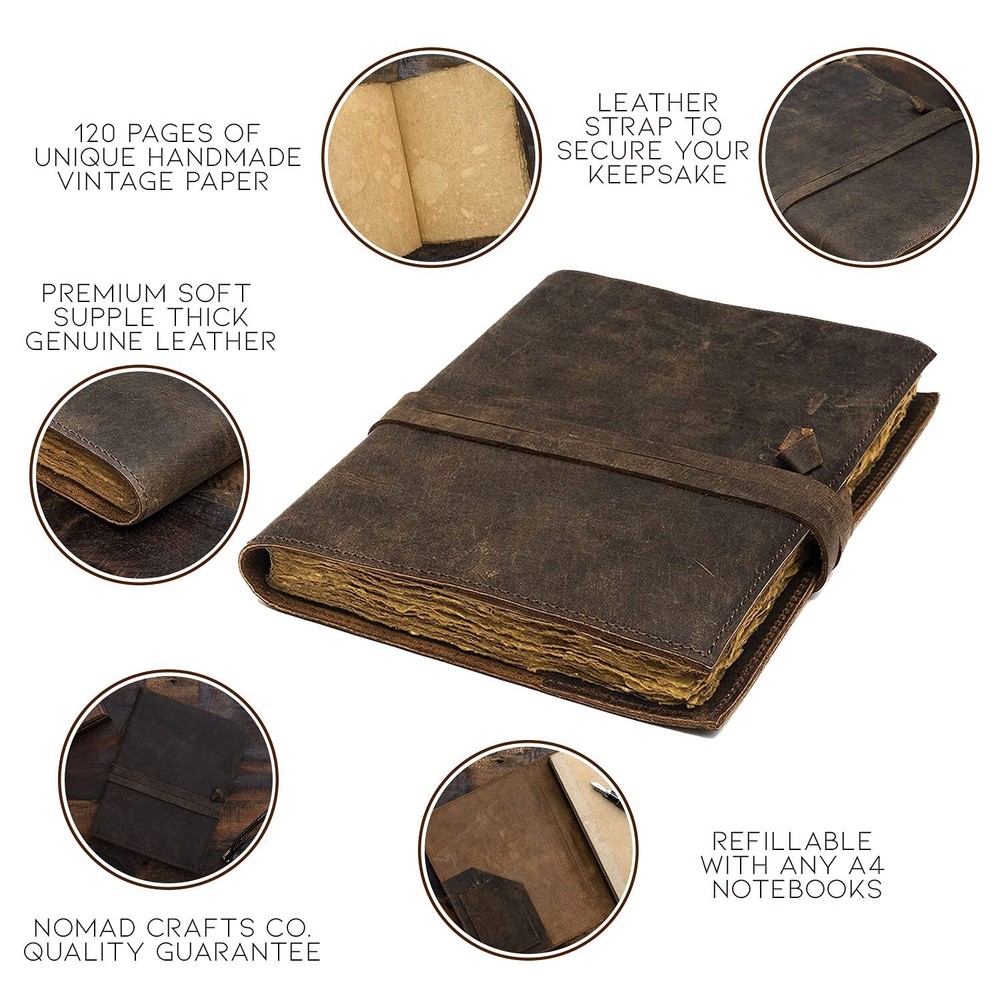 Refillable Vintage Leather Journal - Book of Shadows Journal, Vintage Journal, Writing Journal, Handmade Antique Deckle Edge Paper, Vintage Leather Journal (8.3" x 5.8" - A5, Vintage Brown) Product Details Size: 8.3" x 5.8" - A5 Color: Vintage Brown Brand: NomadCraftsCo. MPN: NOMAD-VIN-REFI UPC: Does not apply EAN: Does not apply Brand: NomadCraftsCo. Color: Vintage Brown Theme: Book Sheet Size: A5 Pages: 120 Pages Cover Material: Leather Style: Vintage Ruling Type: Plain Special Feature: Refillable Number of Items: 1 Manufacturer: NomadCraftsCo. Brand: NomadCraftsCo. Item Weight: 1.08 pounds Package Dimensions: 8.86 x 6.89 x 1.54 inches Color: Vintage Brown Cover Material: Leather Number of Items: 1 Size: 8.3" x 5.8" - A5 Ruling: Plain Sheet Size: A5 Manufacturer Part Number: NOMAD-VIN-REFI Date First Available: September 3, 2020 UNIQUE HANDMADE VINTAGE PAPER - Nomad Crafts Co. Vintage Journal is made with 120 pages of Antique Paper which looks like it was pulled from history. You will fall in love with the the antique handmade cotton paper which is very unique to our Nomads Vintage journal. REFILLABLE - We listened to our loyal customers and introduced our unqiue vintage refillable journal. The Leather cover is refillable with any A5 Journal out there. NomadCraftsCo. Vintage Paper Refills will be available soon. ANY KIND OF PEN - Sketch, Doodle, Write on your Leather Bound Journal with a Calligraphy Pen Fountain Pen, Brush Pen, Ball Pen, Acrylic Colours, Watercolor and many more. PREMIUM SOFT SUPPLE THICK GENUINE LEATHER - The Nomad Leather Journal is made from naturally tanned full grain leather which feels and smells Amazing. It's soft and very comfortable in the hands. Don't be fooled with competitors using cheap substitutes, this is the real deal. OUR 365 DAY REPLACEMENT PROMISE - We are very confident that you will fall in love with your Vintage Journal that we offer a 1 year guarantee .If you are not happy with your leather journal for any reason we will offer a FULL REFUND or a FREE REPLACEMENT. No Questions asked!
