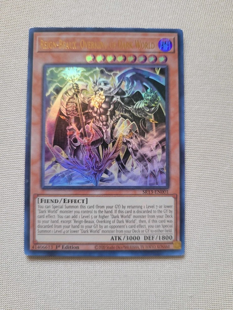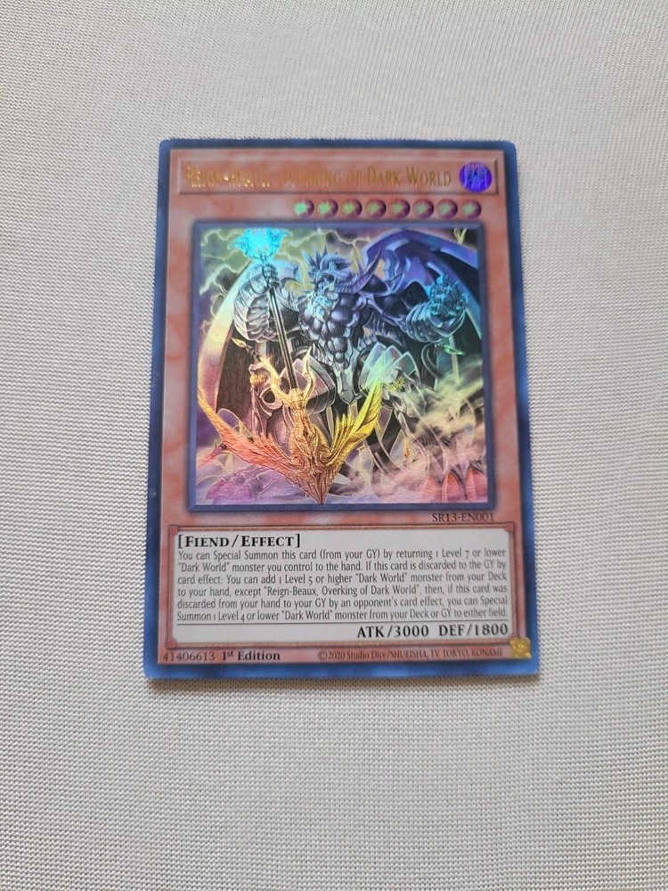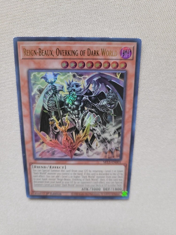 The Reign-Beaux, Overking of Dark World SR13-EN001 Structure Deck: Dark World 1st is an ultra rare Yu-Gi-Oh! TCG card from the Manufacturer Konami. This Fiend-type card has a high attack power of 3000 and defense of 1800, making it a powerful addition to any deck. Being a 1st edition card in near mint condition, it is a highly sought after collectible for fans of the game.