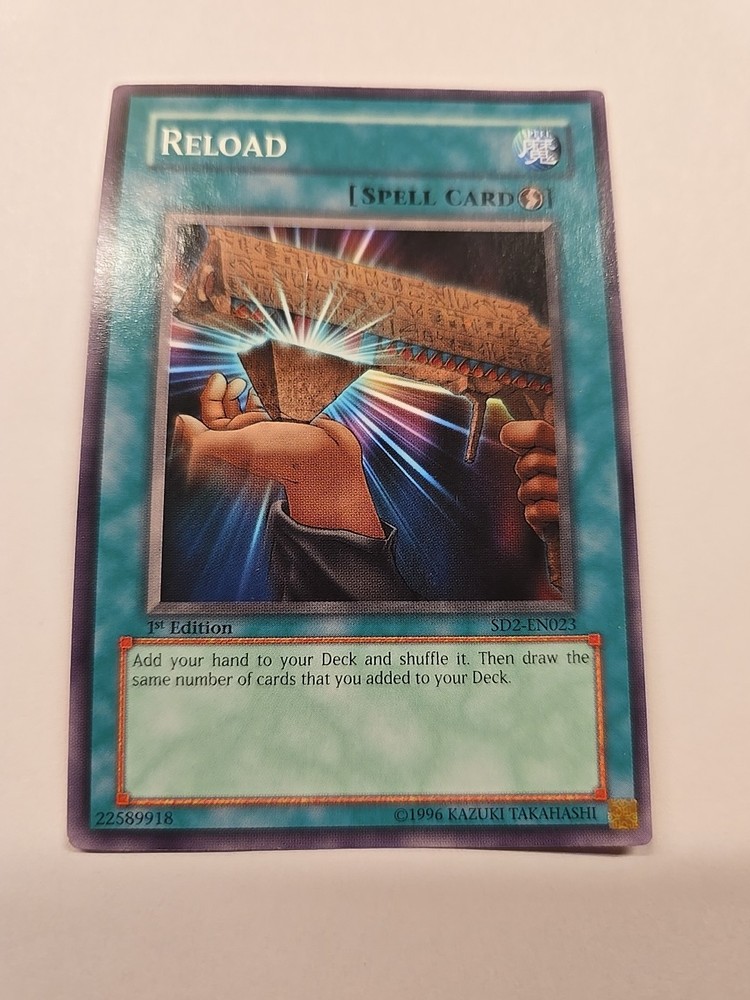 The product is a 1st Edition Spell card named "Reload," with card number SD2-EN023 from the Structure Deck: Zombie Madness set in the Yu-Gi-Oh! TCG. It is a Common/Short Print card manufactured by Konami in English language. The card has an Attack/Power of 0 and a Defense/Toughness of 0.