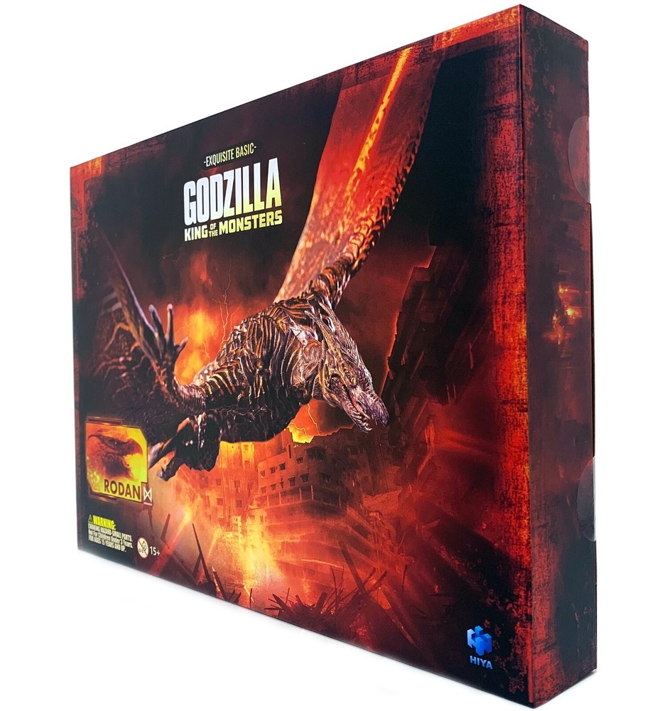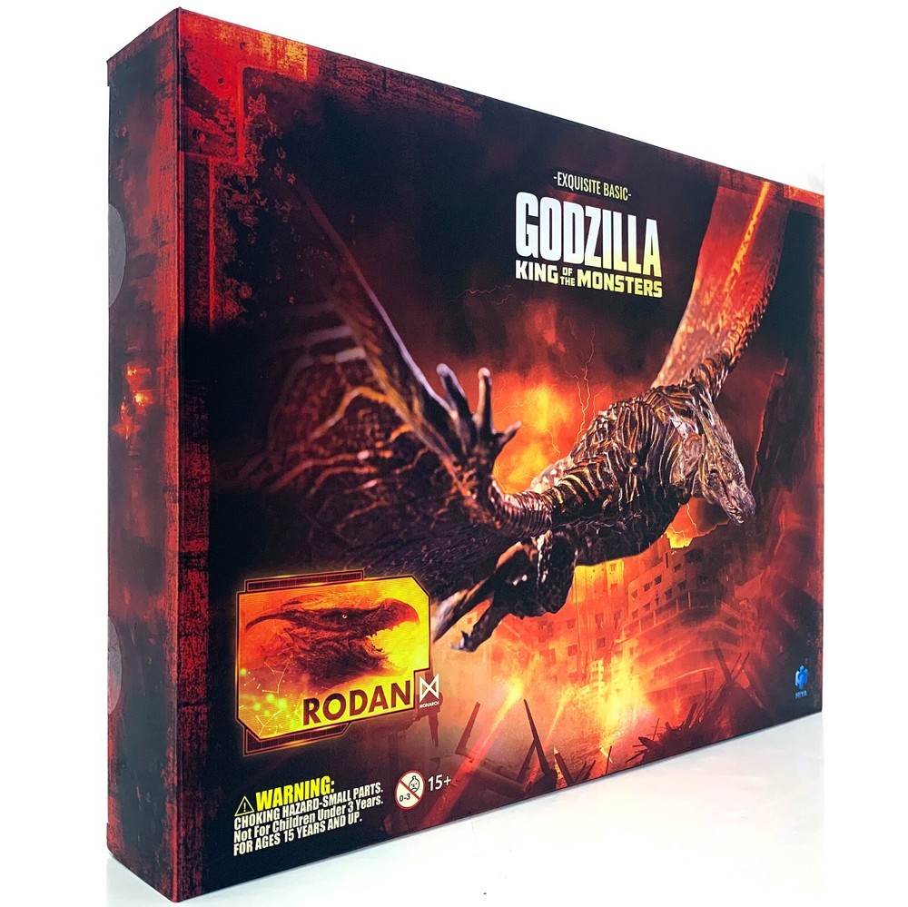 GODZILLA KING OF THE MONSTERS RODAN FLAMEBORN E XQUISITE BASIC ACTION FIGURE by Hiya Toys Based on 2019’s Godzilla: King of the Monsters , Rodan Flameborn action figure from Hiya Toys' Exquisite Basic line vividly captures the majestic fiery presence of the flying kaiju with multiple applications of fluorescent paint on the winds and head. Under UV light Rodan's entire body glows like neon lava! Measures 5” tall with a wingspan over 15” wide and features 13 points of articulation. Includes display base. BRAND NEW, factory sealed.