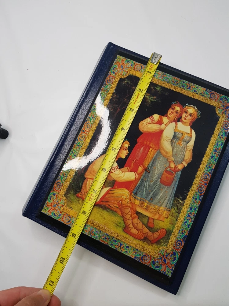 Russian Fedoskino lacquer painting faux leather book bound photo album. Fits 4x6" photographs. Album measuring 9x7x2". In clean condition. Ships fast and packaged securely for safe delivery! Item ships from a clean, smoke-free home. Please contact me if you have any questions or concerns at all! Thank you for your time, business and understanding. Combined shipping available.