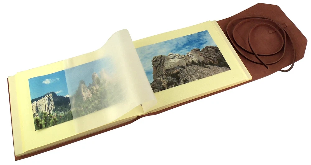 This rustic leather photo album by is the perfect way to store and present your photos with style and class. The rustic leather cover is made from high quality leather that not only looks great, but will last for years to come. The leather photo album holds 100 4x6" or 5x7" photos, and is the perfect size to bring along with you to gatherings with family and friends. This Rustic Leather Photo Album gives a uniquely classic look, style, and feel that you will not find in a modern style photo albums. Natural variations in the leather make each journal a one of a kind, and adds to the unique character of each one. This is a scrapbook style photo album. The cream colored pages are traditional acid-free cardstock with a semi-transparent sheet between each page, allowing you to attach photos to both sides of the pages. This leather photo album makes a perfect unique gift for the person in your life who seems to have everything , or you can buy it for yourself. Either way, you will be pleasantly surprised with the look, smell, quality, and class of this rustic hand made leather photo album by . Rustic Genuine Leather Photo Album with wrap tie closure by Hand made using high quality leather and acid-free cardstock paper. **Photo mounts required.** Traditional cardstock pages with semi-transparent sheet between each page. Includes 100 pages (50 sheets) of cardstock pages. Holds 100 4x6" or 5x7" photos. Album size: 8.25"L x 6"W - Page Size: 7.5"L x 5.5"W - Gift box included Very stylish and classy way to store and present your photos. Makes a great gift.