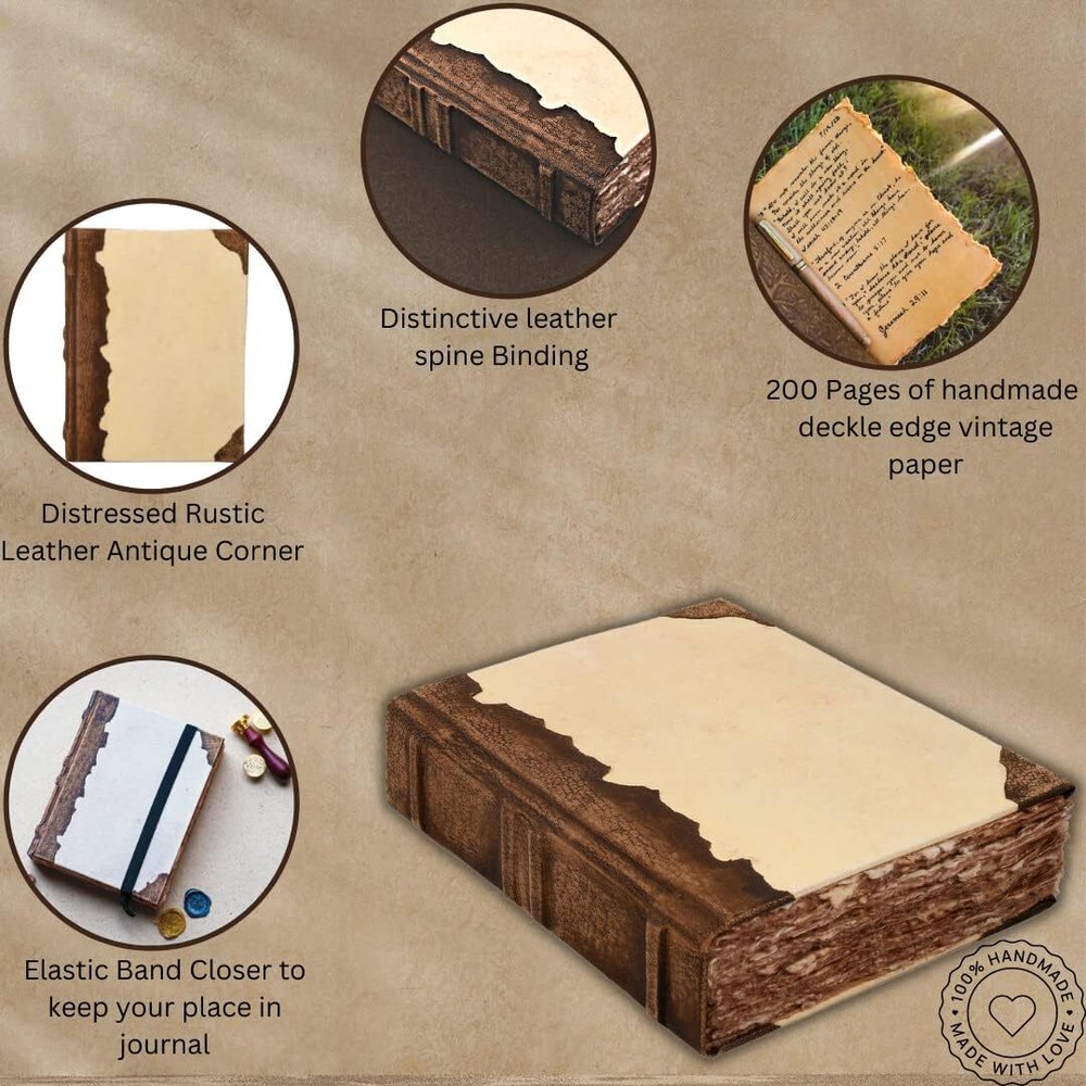 About this item VINTAGE LEATHER JOURNAL: This Vintage Journal is made from genuine buffalo leather, naturally tanned with oils and chrome-free. Each journal varies in look and shade, producing a unique item. The distressed leather look combined with antique vintage paper makes it a perfect book for personal journaling or as a spell book. JOURNAL NOTEBOOKS WITH STURDY BINDING: Belt wrap-around closure keeps the papers secure when not in use. A sturdy hand-stitched binding ensures no pages come loose. This journal comes in the size of 10 x 7 x 1.5 inches. Use this blank journal as a travel journal, daily journal, gratitude journal, pregnancy journal, Bible journal, prayer journal, wedding guest book alternative, writing journal, and more. PERFECT GIFT: This leather notebook makes a unique gift for men and women of all ages. Ideal for antique journal lovers, personalized gift occasions such as birthdays, holidays, anniversaries, or as a special unique gift. WATERCOLOR PAPER: The journal contains no-bleed scrapbook paper suitable for watercolor, acrylic colors, pastel colors, and all dry and wet mediums. Use it like a sketch pad or watercolor sketchbook with any pen on this thick, high-quality paper – perfect for handwriting, drawing, or sketching. Compact and easy to carry in your bag. Dimensions: 10 x 7 x 1.5 inches