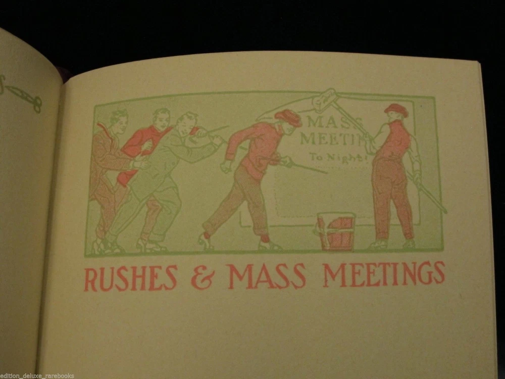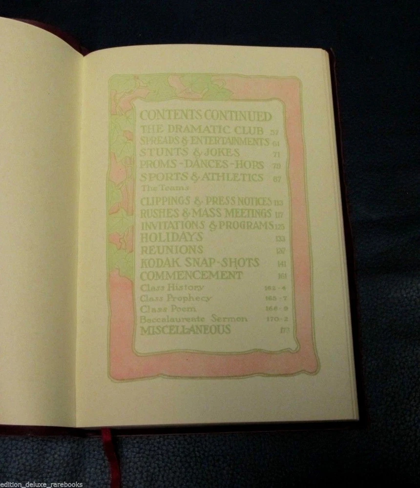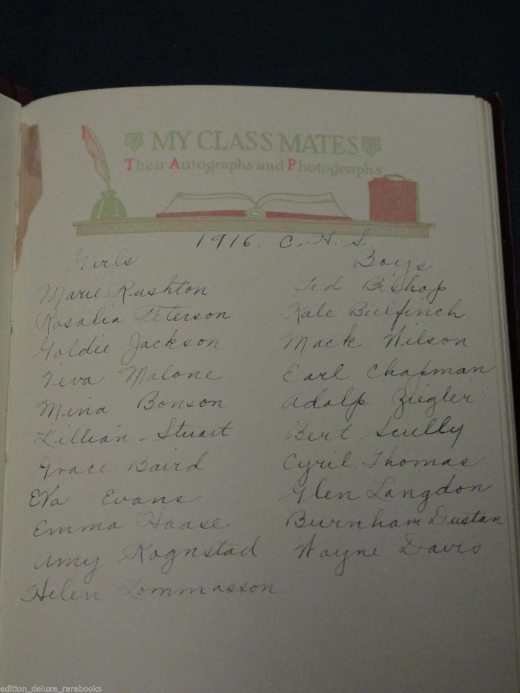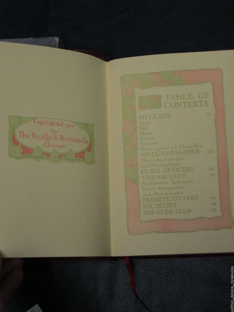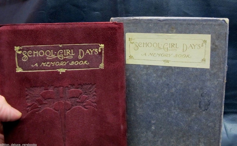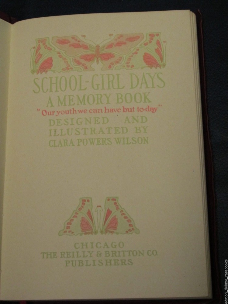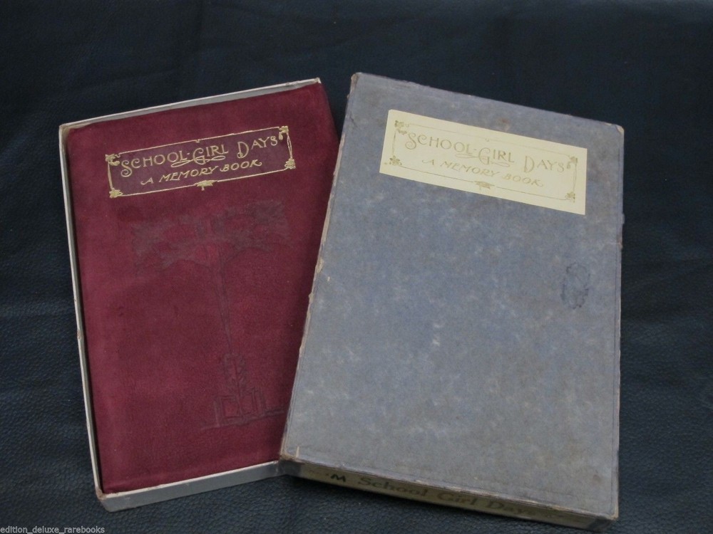 School-Girl Days [A Memory Book. Designed and Illustrated by Clara Powers Wilson. Chicago: The Reilly & Britton Co. 1910.] Nice copy in the original box from the publisher. Box has the title printed twice, front cover and bottom edge. Book feels like suede. Decorated with gilt tooled design and lettering and blind tooled symbol, all on the front cover. Top page edges gilded. Bound with a ribbon bookmark. End papers made from Moire fabric. Illustrated with many period borders and Deco headpieces. Pages are uniformly yellow as printed; not damaged. Very little writing in the book. Mostly appears untouched since its first use. Box has wear and tear around edges; top half looks like it has been reinforced at some point on the inside corners. Overall, excellent condition for age! Froo www.froo.com | Froo Cross Sell, Free Cross Sell, Cross promote, eBay Marketing, eBay listing Apps, eBay Apps, eBay Application Track Page Views With Auctiva's Counter