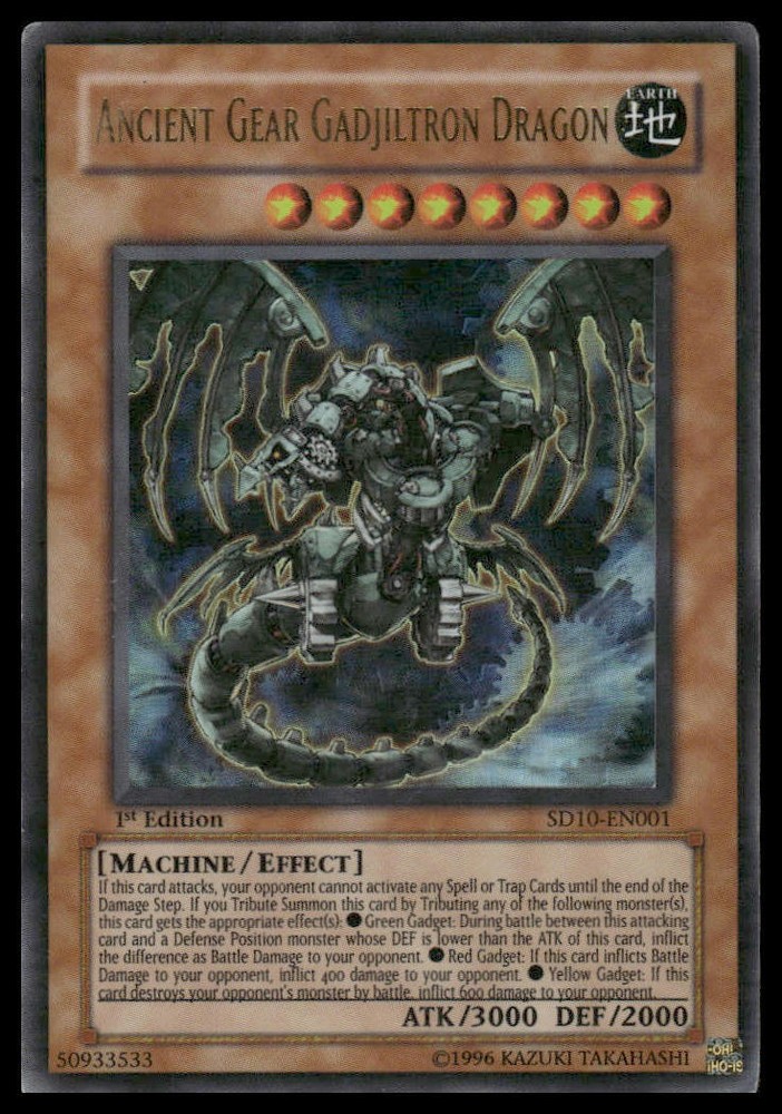 This is a nice example of a Structure Deck: Machine Re-Volt #SD10-EN001 Ancient Gear Gadjiltron Dragon Other important information about this card: Ultra Rare In 2007 Ancient Gear Gadjiltron Dragon played for the . Please check out our other listings for more great cards.