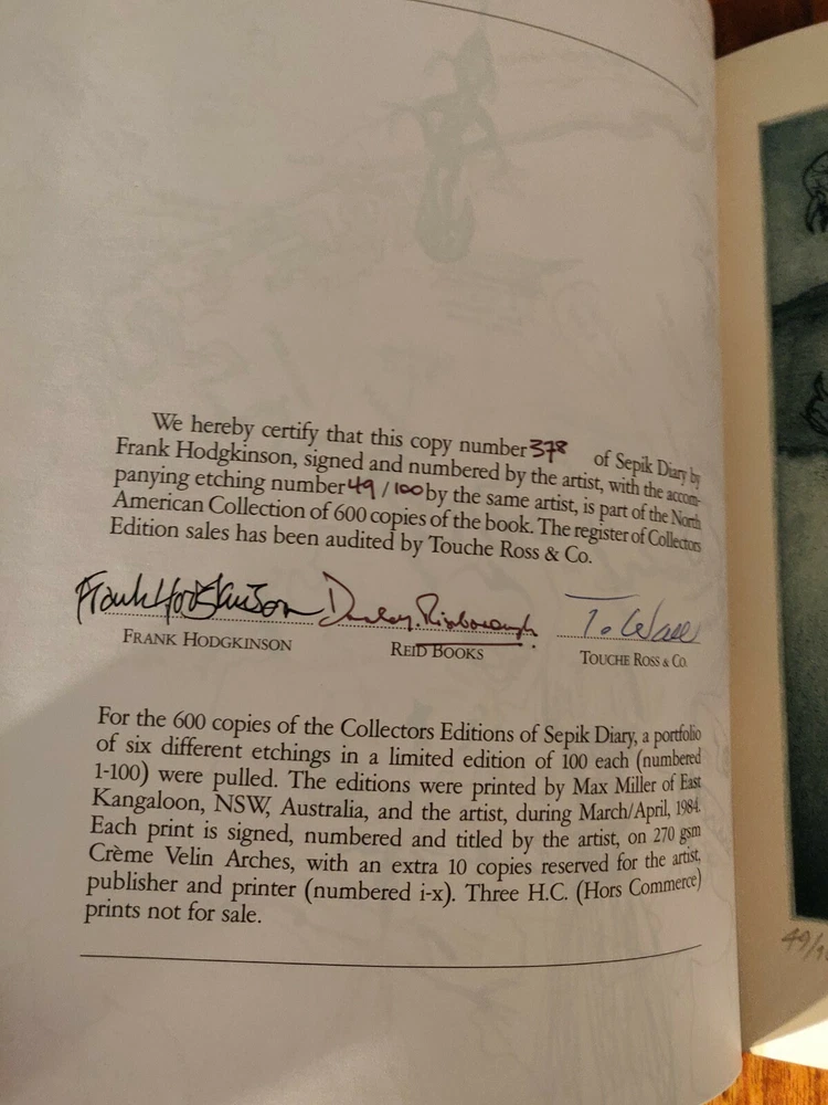 SEPIK DIARY Frank Hodgkinson Collector's Edition, #378/600. Triple Signed (Artist, Publisher, Auditor) Signed Etching #49/100 Account of travels, peoples, and animals down river in Papua New Guinea