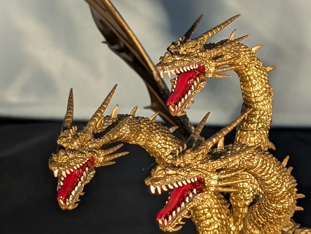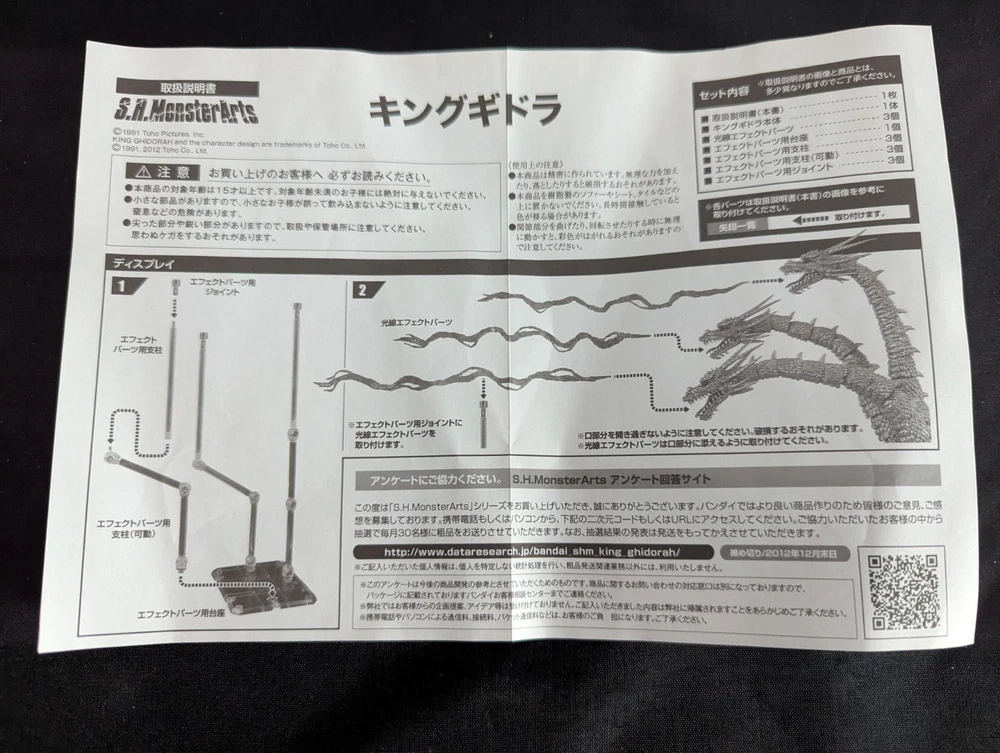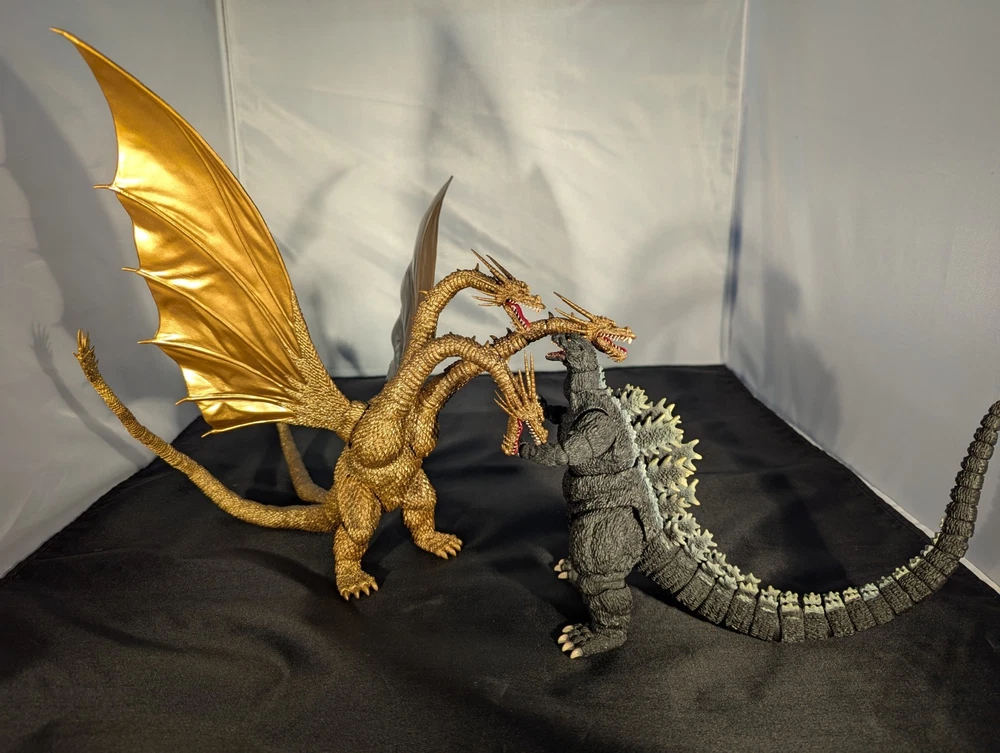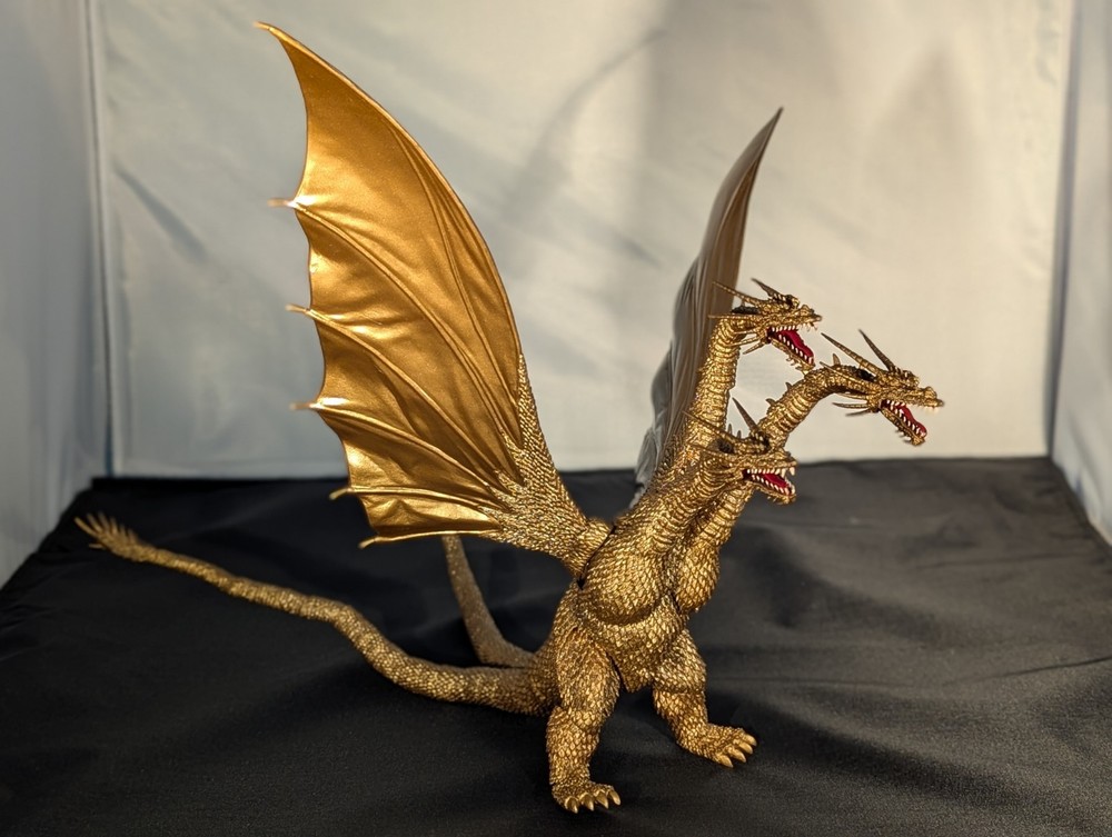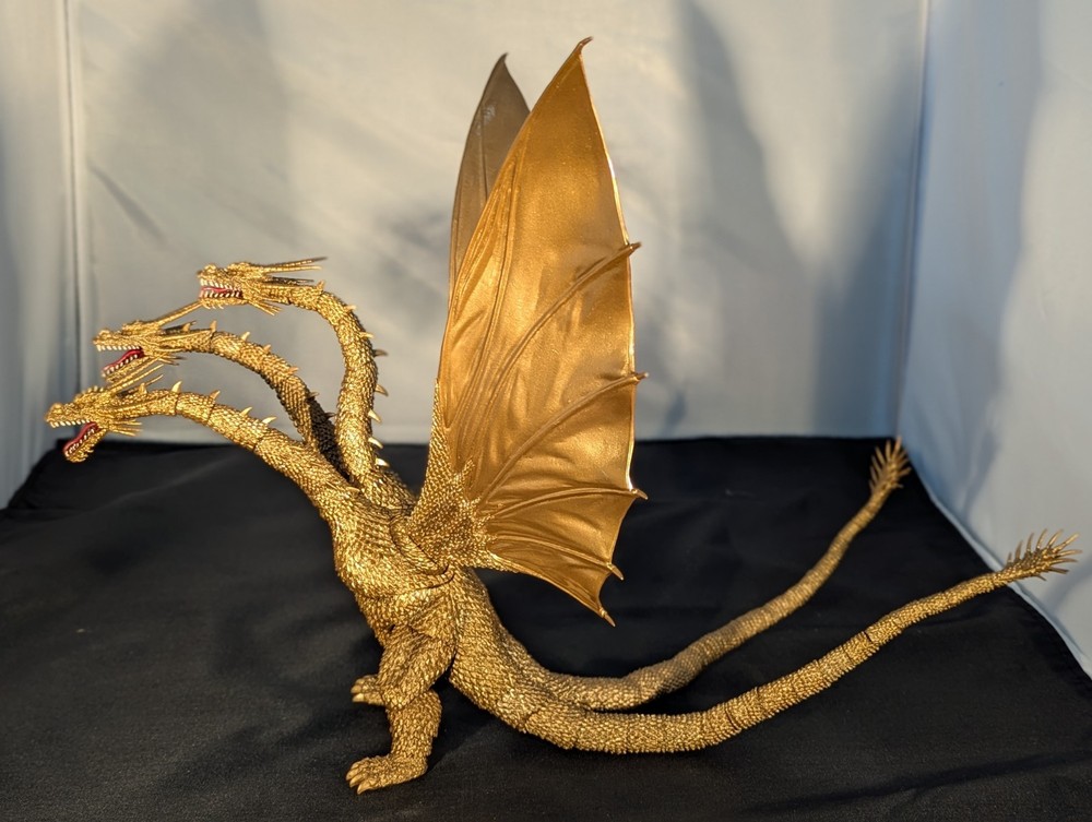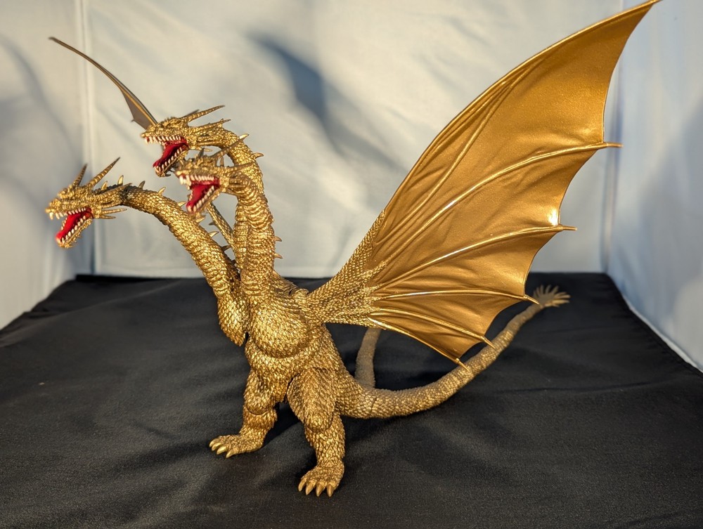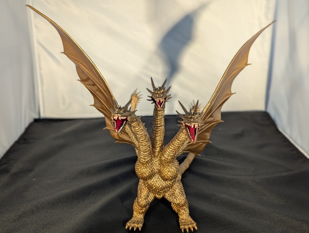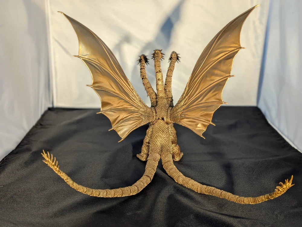 This S.H. Monsterarts King Ghidorah (1991) Figure is a First Edition originally issued in Japan in September 2012 and in the USA in October 2012. It includes the 3 Gravity Beams and Special Stand. All joints are tight and will holdposition in any pose. The wings are also firm and will hold posed position (see photos). The figure, stand and ray effect are in near new condition with no discernible blemishes, gouges or scratches. Includes original documentation. NO original box or packaging. Figure Height: 9.8 inches tall Wing Span: 17 inches Accessories: 3X Gravity Beams Special Stand for Gravity Beams THIS SALE IS FOR THE KING GHIDORAH FIGURE ONLY! Godzilla 1994 Figure shown only for size comparison. U. S. seller. No customs charges or shipping delays. U. S. domestic sales only.