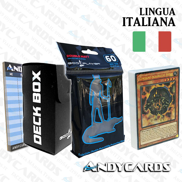 This SR03 Italian Yu-Gi-Oh! deck is an amazing deal—sealed with the "Machina Rescuer" deck, 60 protective sleeves, a sturdy God-Player deck box, counters, and bonus AndyCards. Perfect for collectors and duelists, everything arrives in great condition. Highly recommended for a ready-to-play experience!