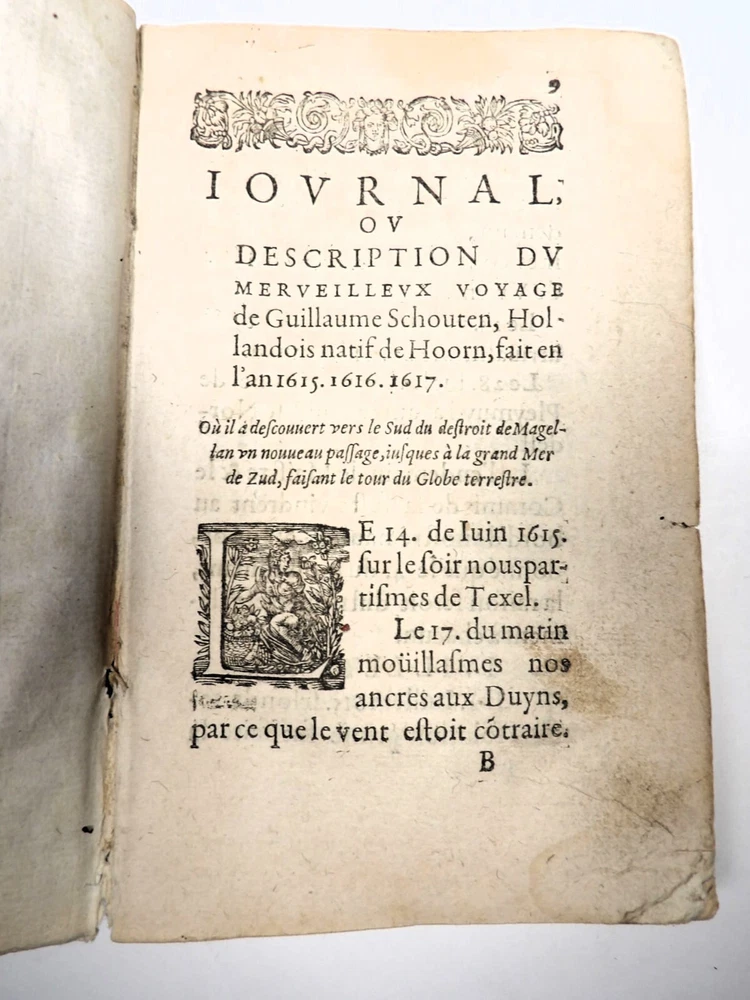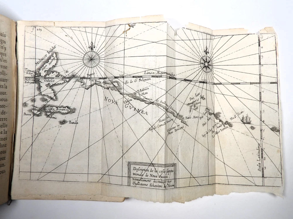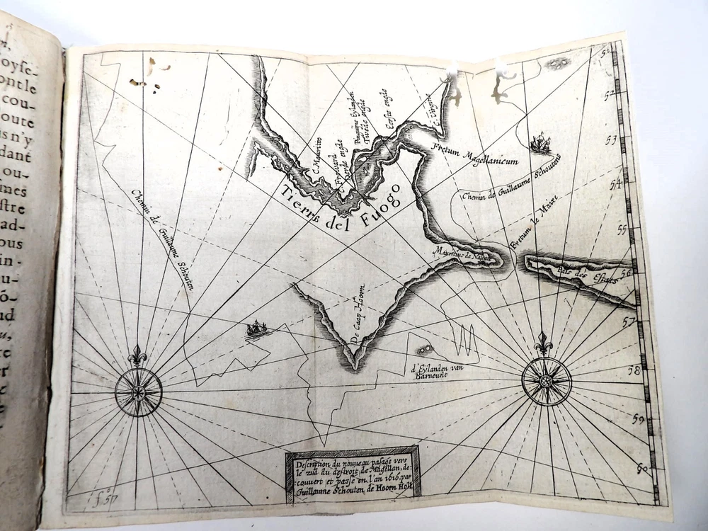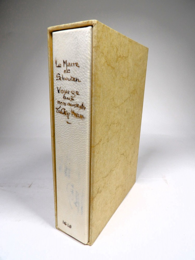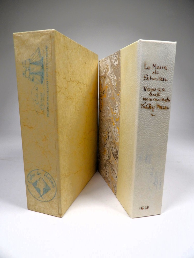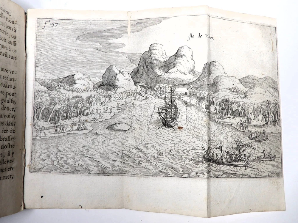 Please consult the conditions of sale at the end of the description before purchasing. SCHOUTEN, Willem Corneliszoon. Journal and Exact Relation of Guill's Voyage. Schouten, in the Indies: By a new strait and by the great Southern Seas which he discovered, towards the Antarctic Pole. Set of new previously unknown Lands, Isles, Fruits, Peoples and strange Animals, which he found on his way: And the rare observations he made there concerning the declination of the Aymant. Paris, Gobert (text) & Tauernier (maps), 1618. Small in-8 – 11.5 x 17 cm. Contemporary vellum binding , mute smooth back. In a modern holster. 7 ff., 232 pp., 4 pl. First French edition from Schouten's popular account of his voyage with Jacob Le Maire in search of an alternative passage to the Strait of Magellan, which was translated into French, German, Latin and English less than a year after the first Dutch edition. Schouten's historic journey was just the third circumnavigation, “during which Cape Horn was discovered and rounded for the first time” (Hill). Copy decorated with 4 plates foldouts (of the usual 8): world map decorated with portraits of Magellan and Schouten, map of Cape Horn, engraving of Horn Island, map of the coast of New Guinea. During a trip, a former owner had the back of the case (20th century) stamped at the time of his passage at Cape Horn. Modest state : damaged binding with gaps and stains, angular gaps in paper on the first leaves without affecting the text, healthy marginal wetting along the length of the work, loose seams (inner hinge of the first cover almost detached from the text), old handwritten notes on the endpapers and title pages, small works of verse, of no great consequence but with a slight damage to the 2 maps and the engraving (but not to the world map). Rare copy (deserving of restoration) of the no less rare original French edition dated 1618. Bookstore L’Art et la Manner 19 Route de Pithiviers 45300 BOYNES France Member of SLAM and LILA ( National Union of Ancient and Modern Bookstores / International League of Old Booksellers) ILAB (International League of Antiquarian Booksellers) English spoken Please don't hesitate to contact us if you have any inquiry The greatest care is taken in the description of the works, however, unintentional errors may be made. Do not hesitate to inform us, including after receipt of your purchase. Regarding shipping: The choice is yours! So that you can benefit from the best services and the most advantageous quality/price ratio, the bookstore offers you: Hand delivery by appointment, in Boynes, near Pithiviers, or in Paris on Saturday mornings or during old book fairs. Sending by the Post Office : by letter for folds less than 3 cm thick (packaging included) or by colissimo. Deposit in Relay Point . The bookstore practices group shipments . If you make multiple purchases in our store, u A new claim for payment with adjusted postage costs will be sent to you within a maximum period of 24 hours . THE insurance is optional (option not available for Relay Point shipments). For shipments to Overseas , please contact us beforehand to find out the exact amount of postal costs. Although packaging costs are offered, packages are reinforced and prepared with great care. The Librairie l'Art et la Manière is always on the lookout for rare and old works, to purchase individually or in batches. We travel primarily in Loiret (45), Paris (75) and the south of Ile-de-France (91, 77, 78, 92, 94) as well as in Yonne (89) and Eure-et-Loir (28). If you would like to sell some, do not hesitate to contact us. Just type “Librairie l’Art et la Manière” into your favorite search engine! First French edition from Schouten's popular account of his voyage with Jacob Le Maire in search of an alternative passage to the Strait of Magellan, which was translated into French, German, Latin and English less than a year after the first Dutch edition. Schouten's historic journey was just the third circumnavigation, “during which Cape Horn was discovered and rounded for the first time” (Hill). Modest state : damaged binding with gaps and stains, angular gaps in paper on the first leaves without affecting the text, healthy marginal wetting along the length of the work, loose seams (inner hinge of the first cover almost detached from the text), old handwritten notes on the endpapers and title pages, small works of verse, of no great consequence but with a slight damage to the 2 maps an