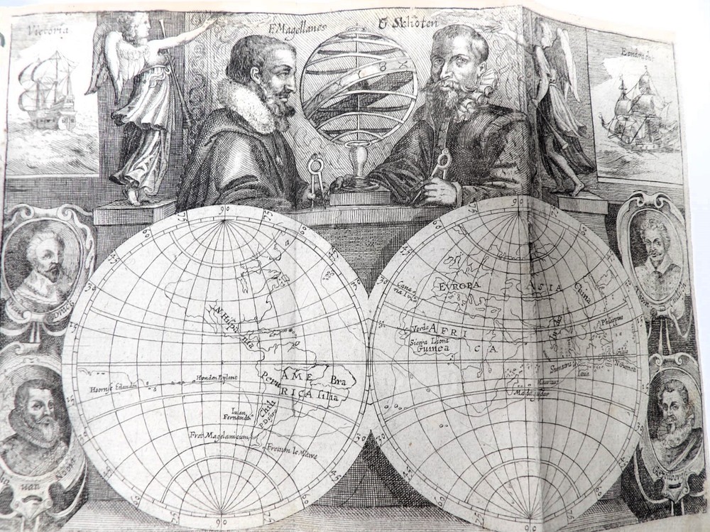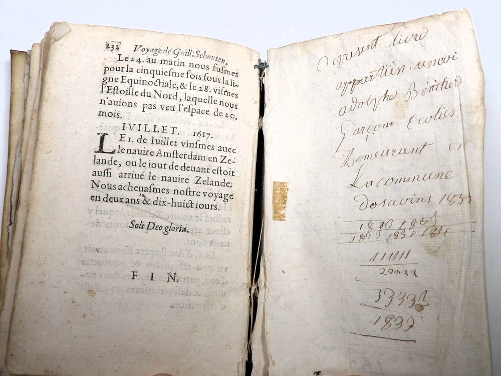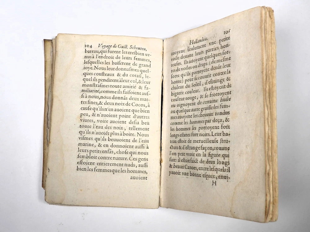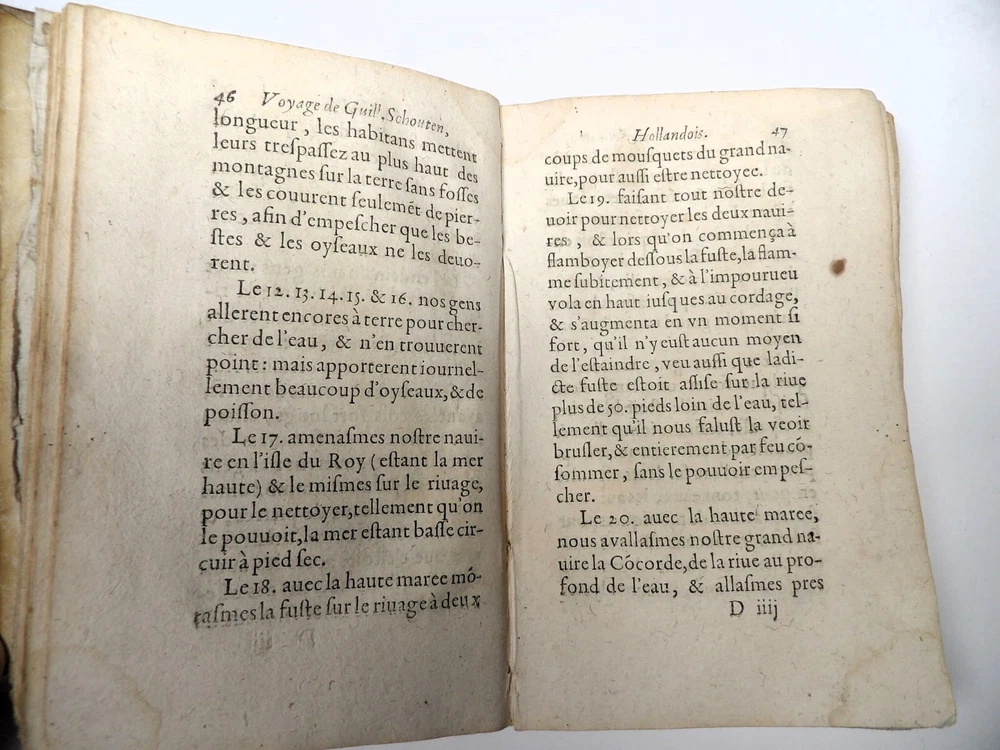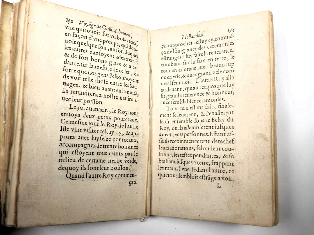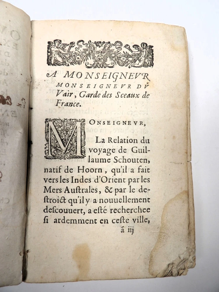Please consult the conditions of sale at the end of the description before purchasing. SCHOUTEN, Willem Corneliszoon. Journal and Exact Relation of Guill's Voyage. Schouten, in the Indies: By a new strait and by the great Southern Seas which he discovered, towards the Antarctic Pole. Set of new previously unknown Lands, Isles, Fruits, Peoples and strange Animals, which he found on his way: And the rare observations he made there concerning the declination of the Aymant. Paris, Gobert (text) & Tauernier (maps), 1618. Small in-8 – 11.5 x 17 cm. Contemporary vellum binding , mute smooth back. In a modern holster. 7 ff., 232 pp., 4 pl. First French edition from Schouten's popular account of his voyage with Jacob Le Maire in search of an alternative passage to the Strait of Magellan, which was translated into French, German, Latin and English less than a year after the first Dutch edition. Schouten's historic journey was just the third circumnavigation, “during which Cape Horn was discovered and rounded for the first time” (Hill). Copy decorated with 4 plates foldouts (of the usual 8): world map decorated with portraits of Magellan and Schouten, map of Cape Horn, engraving of Horn Island, map of the coast of New Guinea. During a trip, a former owner had the back of the case (20th century) stamped at the time of his passage at Cape Horn. Modest state : damaged binding with gaps and stains, angular gaps in paper on the first leaves without affecting the text, healthy marginal wetting along the length of the work, loose seams (inner hinge of the first cover almost detached from the text), old handwritten notes on the endpapers and title pages, small works of verse, of no great consequence but with a slight damage to the 2 maps and the engraving (but not to the world map). Rare copy (deserving of restoration) of the no less rare original French edition dated 1618. Bookstore L’Art et la Manner 19 Route de Pithiviers 45300 BOYNES France Member of SLAM and LILA ( National Union of Ancient and Modern Bookstores / International League of Old Booksellers) ILAB (International League of Antiquarian Booksellers) English spoken Please don't hesitate to contact us if you have any inquiry The greatest care is taken in the description of the works, however, unintentional errors may be made. Do not hesitate to inform us, including after receipt of your purchase. Regarding shipping: The choice is yours! So that you can benefit from the best services and the most advantageous quality/price ratio, the bookstore offers you: Hand delivery by appointment, in Boynes, near Pithiviers, or in Paris on Saturday mornings or during old book fairs. Sending by the Post Office : by letter for folds less than 3 cm thick (packaging included) or by colissimo. Deposit in Relay Point . The bookstore practices group shipments . If you make multiple purchases in our store, u A new claim for payment with adjusted postage costs will be sent to you within a maximum period of 24 hours . THE insurance is optional (option not available for Relay Point shipments). For shipments to Overseas , please contact us beforehand to find out the exact amount of postal costs. Although packaging costs are offered, packages are reinforced and prepared with great care. The Librairie l'Art et la Manière is always on the lookout for rare and old works, to purchase individually or in batches. We travel primarily in Loiret (45), Paris (75) and the south of Ile-de-France (91, 77, 78, 92, 94) as well as in Yonne (89) and Eure-et-Loir (28). If you would like to sell some, do not hesitate to contact us. Just type “Librairie l’Art et la Manière” into your favorite search engine! First French edition from Schouten's popular account of his voyage with Jacob Le Maire in search of an alternative passage to the Strait of Magellan, which was translated into French, German, Latin and English less than a year after the first Dutch edition. Schouten's historic journey was just the third circumnavigation, “during which Cape Horn was discovered and rounded for the first time” (Hill). Modest state : damaged binding with gaps and stains, angular gaps in paper on the first leaves without affecting the text, healthy marginal wetting along the length of the work, loose seams (inner hinge of the first cover almost detached from the text), old handwritten notes on the endpapers and title pages, small works of verse, of no great consequence but with a slight damage to the 2 maps an