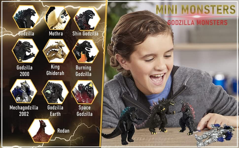 7 figures with movable joints, 3 figures with immovable joints: bring more fun than ever High Quality and Details 【Height & Length】2-3.6 inches in height, up to 5 inches in length 【Superior Quality】Passed CPC Children Safety Certificate, ASTM F963-16/17 and CPSIA standards. Environmental friendly, nontoxic, non-radioactive and waterproof. 【Worry-free shopping】We offer the Professional Customer Support: reply to your inquiry within 12-24 hours, send replacements within next 12-24 business hours. If you have any issues about your purchase, please give us a chance to make things right. We will be more than happy to assist you. Product Description Unleash the Kaiju Battle: 10 Movable Joint Action Figures in the Ultimate Godzilla Toy Set! Epic Godzilla Toy Set: 10 Movable Joint Action Figures for Fans of the King of the Monsters! Introducing an action-packed Godzilla toy set featuring 10 iconic kaiju characters from various Godzilla movies. With movable joints and intricate design, these action figures are perfect for playtime adventures or display in any Godzilla fan's collection. Imaginative Play at Its Best: Realistic Detailing and Endless Posability with the Godzilla Toy Set! Realistic Detailing and Endless Play Possibilities: Perfect for Action-Packed Playtime! Each figure in this Godzilla toy set is intricately designed with attention to detail, capturing the fierce and majestic look of the legendary creatures. With movable joints, these action figures offer endless possibilities for dynamic posing and realistic battle scenes, providing hours of imaginative play. Built to Last, Thrill, and Conquer: Special Edition Figures and Durable Materials in the Godzilla Toy Set! Special Edition Figures and Durable Materials: Built to Last and Thrill Fans of All Ages! This Godzilla toy set includes special editions like Burning Godzilla and MechaGodzilla, adding extra excitement to the mix. Made from durable materials, these action figures are built to withstand rough play and are sure to provide long-lasting enjoyment for fans of all ages. Play or Display: Versatile and Exciting, Anytime, Anywhere with the Godzilla Toy Set! Versatile Set: Perfect for Play or Display, Anytime, Anywhere! Whether it's recreating epic battles between Godzilla and his foes or proudly displaying them on a shelf, this versatile toy set is a must-have for any Godzilla fan. The immovable joint figures are perfect for display on your desk or as cake toppers for a Godzilla-themed birthday party, making it a versatile set for play or display anytime, anywhere.