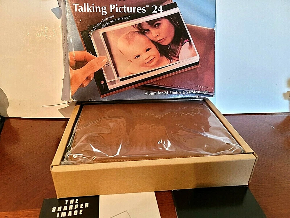Box opened to take pictures. New inside. Still in sealed bag. Sharper Image Talking Pictures 24. Handsome leather like cover. Flash memory holds digital recordings forever. Album holds 24 - 4 x 6 " photos. Record a personalized 10 second message. Can record 24 messages. #20