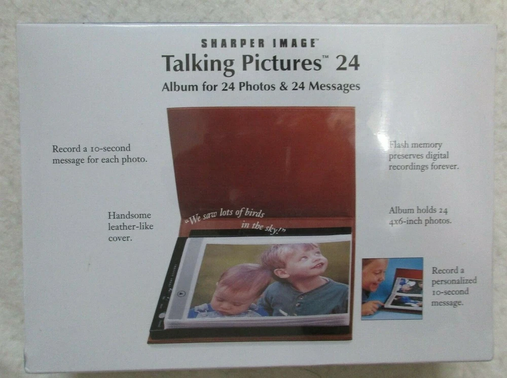 These Sharper Image Talking Pictures are new in the box. It is for 24 4 x 6" photos. Each photo has a 10-second message.