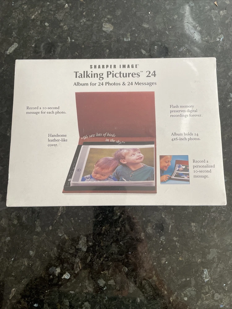 Introducing the Sharper Image Talking Pictures 24 Album - the perfect way to keep your cherished memories safe and organized. This album can hold up to 24 photos, each measuring 4" x 6", and comes with the added feature of allowing you to record a personalized message for each picture. Sealed in box.