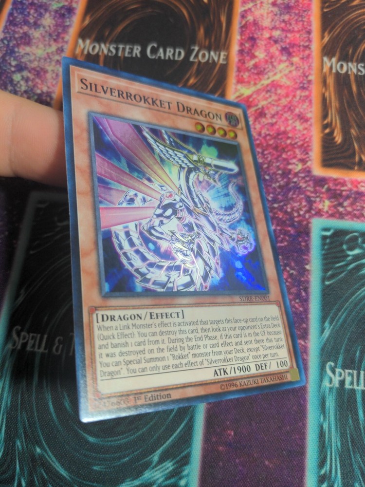 Silverrokket Dragon - SDRR-EN001 - Super Rare - 1st Edition Image is a stock photo of the card. You will receive the card in Near Mint condition Condition: Near Mint ATK/DEF : 1900/100 Attribute : DARK Card Number : SDRR-EN001 Card Rules : Rulings powered by The Netrep API. [Re: Bottomless Trap Hole] If the opponent has 'Lord of D.' on the field and activates 'The Flute of Summoning Dragon' to Special Summon 2 copies of 'Blue-Eyes White Dragon', you can activate this card and both will be removed from play. 'Lord of D.' does not protect the Dragons because 'Bottomless Trap Hole' does not target. The same situation would occur if only 1 'Blue-Eyes White Dragon' was Special Summoned, 'Bottomless Trap Hole' still does not target. [Re: Burst Stream of Destruction] If you activate 'Burst Stream of Destruction', and the 'Blue-Eyes White Dragon' is removed from the field with 'Interdimensional Matter Transporter' or 'Compulsory Evacuation Device', or flipped face-down with 'Book of Moon', or destroyed by 'Ring of Destruction', 'Burst Stream of Destruction''s effect still resolves. [Re: Burst Stream of Destruction] It is an effect of 'Burst Stream of Destruction' that 'Blue-Eyes White Dragon' cannot attack, so if 'Non-Spellcasting Area' is on the field, 'Blue-Eyes White Dragon' CAN attack. If 'Imperial Order' is activated later, 'Burst Stream of Destruction''s effect is negated and 'Blue-Eyes White Dragon' CAN attack. [Re: Burst Stream of Destruction] If 'Burst Stream of Destruction''s activation is negated by 'Magic Jammer', then 'Blue-Eyes White Dragon' can attack. [Re: Burst Stream of Destruction] NO copies of 'Blue-Eyes White Dragon' can attack the turn that 'Burst Stream of Destruction''s effect is applied, even if they are Summoned after 'Burst Stream of Destruction' is played. [Re: Destiny Hero - Diamond Dude] Since you are only activating the Normal Spell Card's effect, and not the Normal Spell Card itself, you do not pay costs and you do not have to meet any activation requirements. For example, you would not pay 1000 Life Points for 'Confiscation', or discard 1 card for 'Monster Reincarnation', or need a 'Blue-Eyes White Dragon' on the field to activate the effect of 'Burst Stream of Destruction'. [Re: Double Attack] If you use 'Cost Down' so that your 'Blue-Eyes White Dragon' in your hand is Level 6, then you cannot discard it to activate 'Double Attack' and target your Level 7 'Dark Magician' on the field. [Re: Inferno Tempest] If you attack 'Blue-Eyes White Dragon' with 'Ojama Green' or some other 0 ATK monster, you can activate 'Inferno Tempest' after damage calculation. Then 'Ojama Green' is sent to the Graveyard after 'Inferno Tempest' resolves. [Re: Last Turn] You CAN Special Summon a high-level monster that has no Special Summoning restrictions for 'Last Turn', such as 'Blue-Eyes White Dragon' or 'Dark Magician of Chaos'. [Re: Mirror Wall] If you have 2 copies of 'Mirror Wall', and a monster attacks, its ATK is one-quarter. So 'Blue-Eyes White Dragon' would have 750 ATK, for example. If 1 of the 'Mirror Wall' copies leaves play, then the ATK is increased to half (if both copies leave play, the ATK is restored to full.) [Re: Pole Position] If 'Pole Position' is active, and your opponent controls 'Blue-Eyes White Dragon' and 'Skull Servant', and you activate 'Smashing Ground', 'Blue-Eyes White Dragon' is unaffected by Spell Cards, so the effect of 'Smashing Ground' disappears. [Re: Pole Position] If you control 'Dark Magician' and your opponent controls 'Blue-Eyes White Dragon', and you activate 'Flint' targeting 'Blue-Eyes White Dragon', and your opponent chains 'Pole Position', then 'Flint' is equipped meaninglessly to 'Blue-Eyes White Dragon'. If 'Blue-Eyes White Dragon' is destroyed, 'Flint' can be equipped to 'Dark Magician' meaninglessly if you choose (even if other monsters are on the field). [Re: Pole Position] EXAMPLE #2 The opponent has 'Blue-Eyes White Dragon' (3000 ATK) and 'Pole Position' face-up on the field. I have 'Gemini Elf' (1900 ATK), and an 'Opticlops' (1800 ATK) equipped with 'Axe of Despair'(+1000 ATK 2800 total) face-up on the field, and a Set 'Ring of Destruction'. If I activate 'Ring of Destruction' to destroy 'Blue-Eyes White Dragon', then 'Opticlops' will be the highest ATK monster on the field, and cause an infinite loop (it is the highest, it isn't, it is, it isn't, etc.). Therefore, I cannot target 'Blue-Eyes White Dragon' with 'Ring of Destruction'. [Re: Precious Cards from Beyond] If you Tribute Summon 'Blue-Eyes White Dragon' for 1 Tribute using 'Cost Down', you can't activate 'Precious Cards from Beyond''s effect. [Re: Silent Swordsman LV5] If you control 'Blue-Eyes White Dragon' and 'Silent Swordsman LV5', and your opponent activates 'Fissure', the monster with the lowest ATK is 'Silent Swordsman LV5', but it is unaffected by Spell Cards, so the effect of 'Fissure' disappears. [Re: Skill Drain] 'Skill Drain' does not stop you from activating Ignition Effects, but it does negate their effects as long as the Effect Monster remains on the field. If you Tribute 'Cannon Soldier' to itself while 'Skill Drain' is active, 'Cannon Soldier''s effect is not negated because 'Cannon Soldier' is in the Graveyard, but if you Tribute a different monster for 'Cannon Soldier''s effect, then the effect is negated and your opponent takes no damage. Likewise, if you activate 'Winged Minion''s effect while 'Skill Drain' is active, 'Winged Minion' is no longer on the field and its effect resolves. If you activate 'Exiled Force''s effect while 'Skill Drain' is active, 'Exiled Force' is no longer on the field and you can select and destroy 1 monster on the field. If you Tribute 'Paladin of White Dragon' to activate its effect while 'Skill Drain' is active, it is no longer on the field and you can Special Summon 'Blue-Eyes White Dragon'. If you Tribute 'Great Dezard' while 'Skill Drain' is active, it is no longer on the field and you can Special Summon 'Fushioh Richie'.