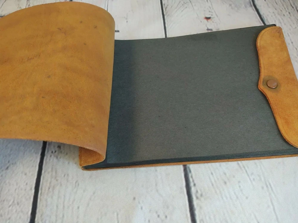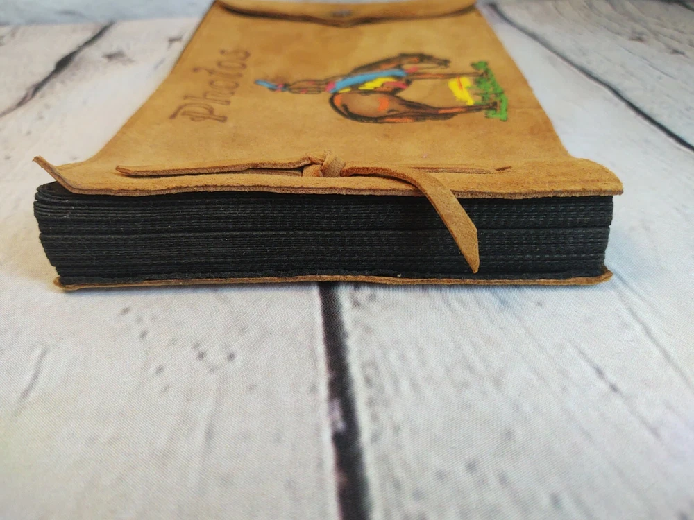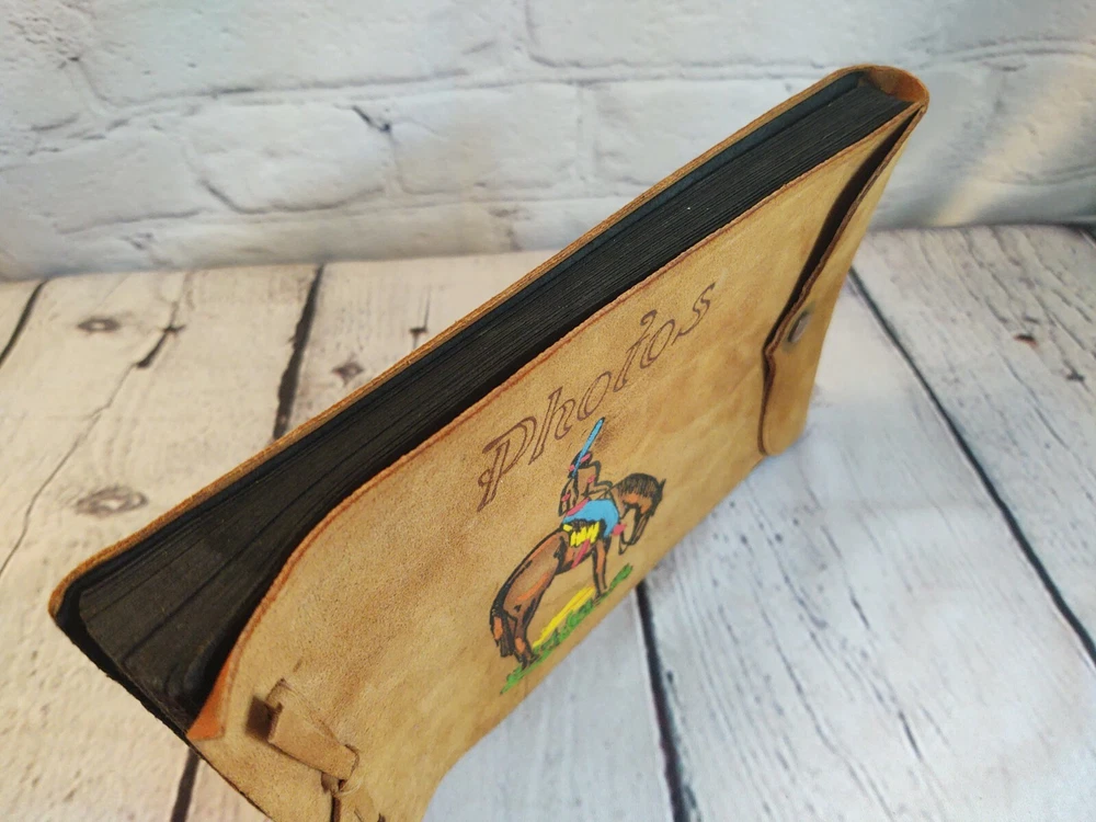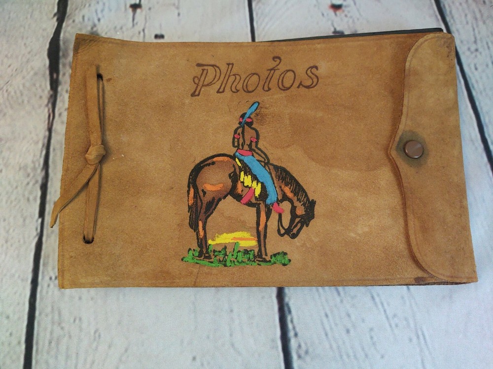 Small Photo Book 6 1/2" Native American Southwestern Cover. Condition is Good. Inside is new however does have some discoloration on front and back covers. Cover is Leather/Suede. Nice artwork. Shipped with USPS First Class Mail.