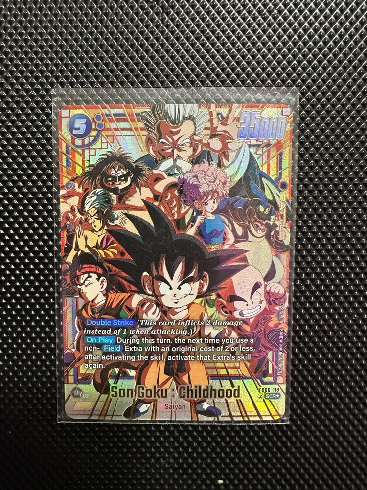 The product is a Son Goku childhood alternate art card from the Dragon Ball Super: Fusion World game. This Super Parallel Rare card features the character in his Raging Roar form from the Rivals Clash set. It is a standard-sized card with a holo foil finish and is part of the exclusive and limited edition collection illustrated by Akira Toriyama. The card is not autographed and has a Blazing Aura stage, making it a highly sought-after collectible for fans of the Dragon Ball franchise.