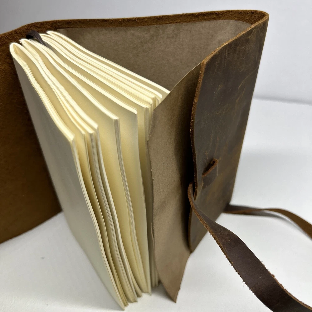 This handmade leather journal from Sovereign Gear is the perfect tool for capturing your thoughts, ideas, and memories. With its blank pages, you have the freedom to write, sketch, or doodle to your heart's content. The journal is bound with a sturdy strap that keeps your pages safe and secure. The cover is made of high-quality leather that adds a touch of elegance and durability, making it the perfect accessory for both personal and professional use. Whether you're a writer, artist, or simply someone who loves to jot down their thoughts, this journal is perfect for you. Invest in a piece that will last a lifetime and never let your ideas slip away again.