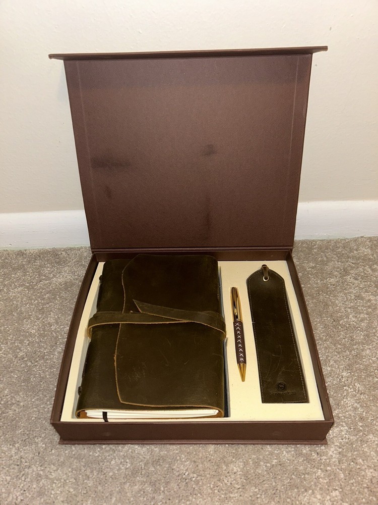 New, Open Box. No pages have been written on. Includes leather pen and leather page marker....