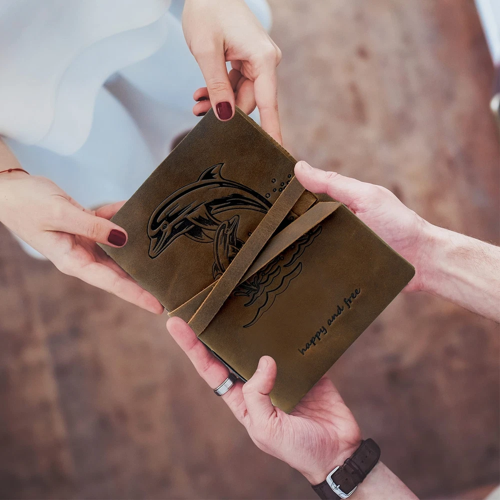 Sovereign-Gear Leather Bound Journal for Men and Women, Handmade Gift Set with Dolphin Embossed Journal and Stylish Pen, Vintage and Classic, Notebook, Sketchbook, Planner and Diary (300 Pages) (8x6) ✓ Free 60 Day Returns ✓ Free Express Shipping Description: Features: UNIQUE GIFT SET: Handmade leather journal with matching bookmark, designer pen and hidden pen holder. Presented in an eco-friendly recycled box. A timeless gift for that special someone who loves to write. PREMIUM LEATHER: Crafted with delicate yet super tough buffalo leather, including a long strap that secures the journal firmly. Our genuine leather is thicker than competitors and offers lifetime durability with lasting softness. Embossed jumping Dolphins on the soft cover will inspire you to make a splash with your words. RUSTIC DESIGN: Achieves a unique and distressed look when scratched and features decorative stitching for added charm. Coated with special natural oils that make handling a joy. Plus, it has a wonderful authentic leather smell that inspires you to write daily. QUALITY CREAM PAPER: 300 premium unlined multipurpose sheets for notes, daily plans, sketches, inspiring ideas, memories and more. Zero bleed through with fountain pens. Not refillable. PERFECT SIZE: 8x6" made to suit a wide range of writing styles. We also offer many other sizes and styles of journals, including refillable journals. There's something for everyone! Product Details: Brand: Sovereign-Gear Color: Brown Theme: Book Cover Material: Leather Style: Dolphin Ruling Type: Plain Special Feature: Pen Holder Number of Items: 1 Binding: Unknown Binding Manufacturer: Sovereign-Gear Manufacturer: Sovereign-Gear Brand: Sovereign-Gear Item Weight: 1.41 pounds Product Dimensions: 8.46 x 6.69 x 1.97 inches Item model number: SG-Dolphins-Journal-8x6 Is Discontinued By Manufacturer: No Color: Brown Cover Material: Leather Material Type: leather Number of Items: 1 Size: 8" x 6" Ruling: Plain Manufacturer Part Number: SG-LEJ-Dolphins Date First Available: July 18, 2019