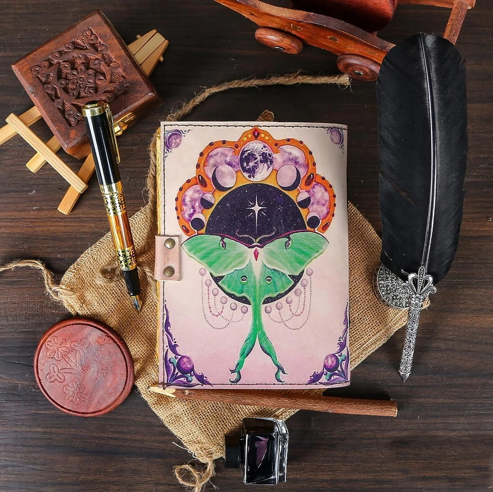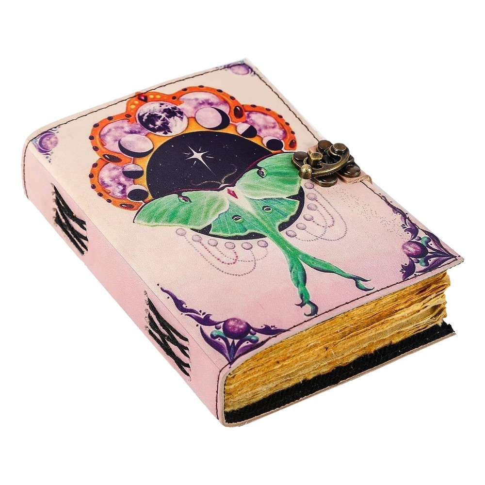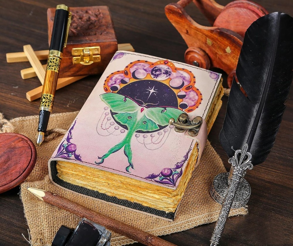 LUNA MOTH - Leather journal witchcraft book of shadows grimoire notebook journal with lock is made with 200 pages of Antique Paper which looks like it was pulled from history. book journal You will fall in love with the the antique handmade cotton paper which is unique to our Vintage Journal Notebook. • The vintage clasp lock will keep all your valuable writing locked inside. Sturdy hand stitched binding to make sure that no paper comes out loose from your spell notebook. • Sketch, Doodle, Write on your Leather Blank Spell Journal with a Calligraphy Pen Fountain Pen, Brush Pen, Ball Pen, Acrylic Colors, Watercolor and many more. We guarantee no bleed through.
