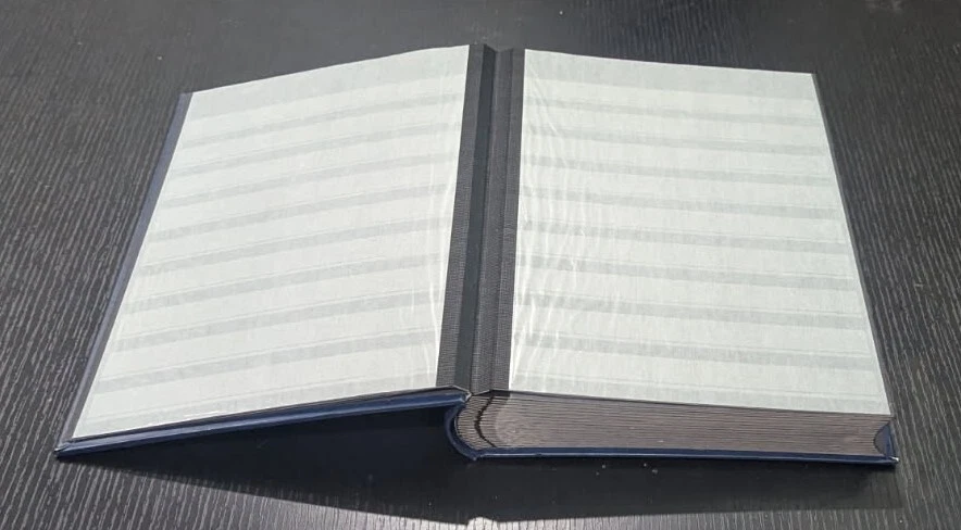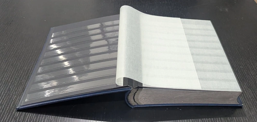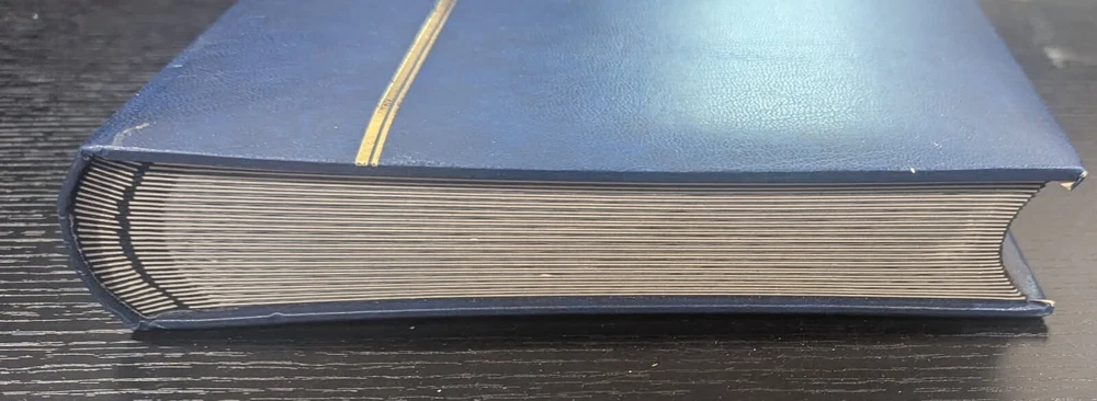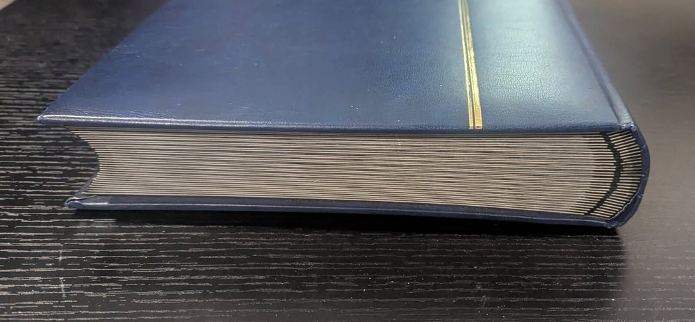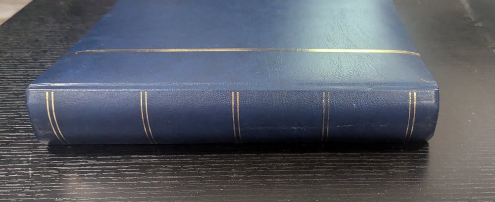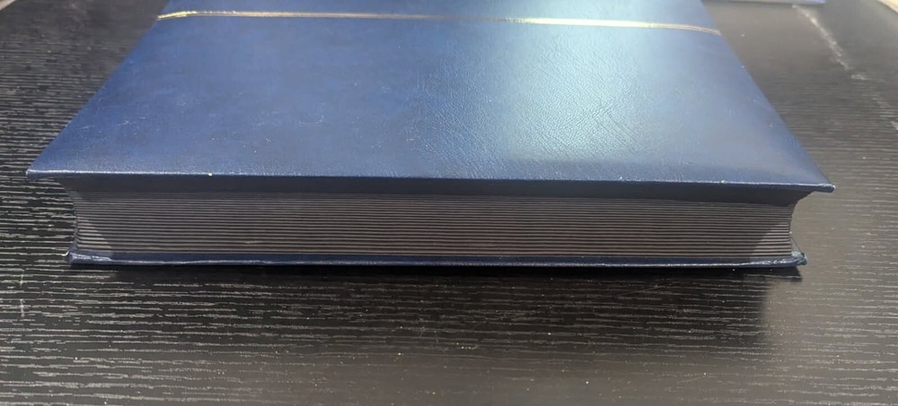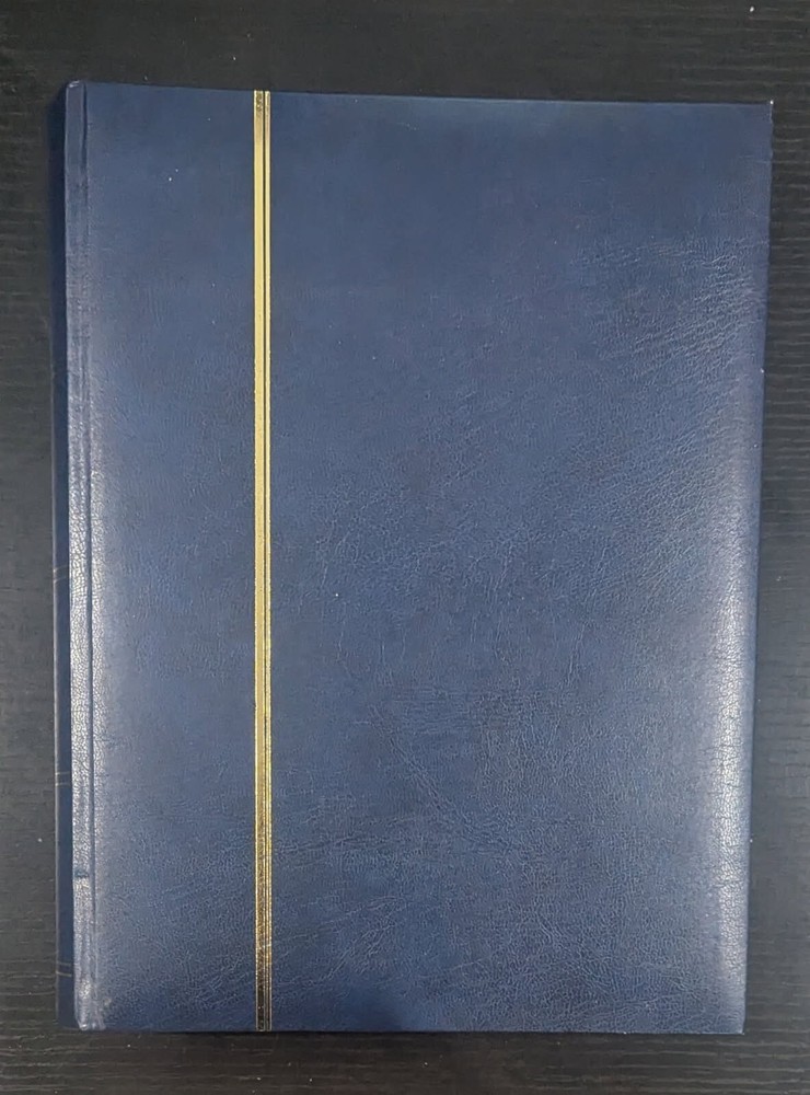 Blue Leather-Bound Stockbook for Postage Stamp Collecting: New Without Tags. 32 double-sided pages, 9 strips each, with intervening glassine leaves. Highest quality stockbook for stamp collecting. Bound in blue leather. 32 double-sided pages for holding postage stamps. Each page is made of high-quality, thick black cardstock with corners still sharp and the stamp storage strips tight against the page. Glassine page liners are on either side of each page to protect stamps from the adjacent page. Each page side has 9 clear strips for holding postage stamps. This book is large for stamp stockbooks: standard size A4 pages (8.5" x 11.0"). This is the same product sold with the "Lighthouse" label on Amazon,, etc. Current retail cost for a brand new stockbook with these specifications is approximately $133.00. I purchased this to help my father organize his own stamp collection. He ended up not needing it. Complete stockbook is: Width: 9.5" Length: 12.0" Height: 1.875" Total weight of book: 4 lbs 4 oz.